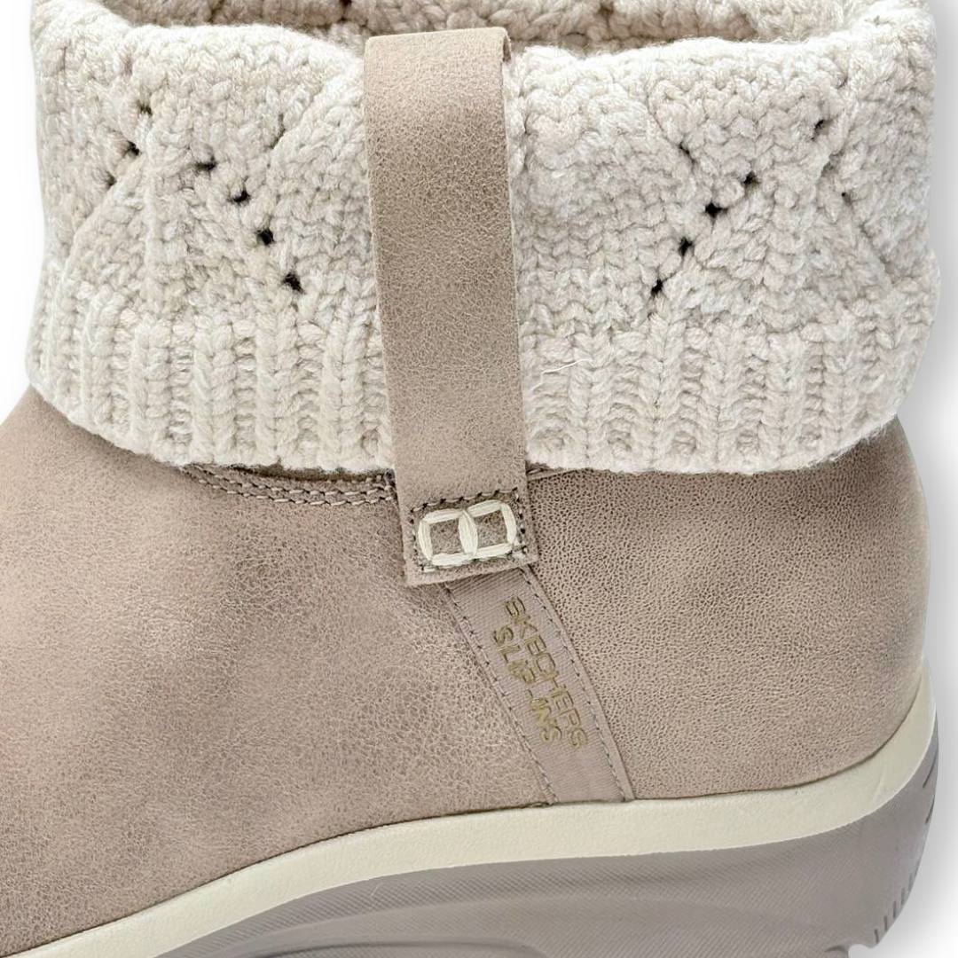 Botines Skechers taupe con forro cálido y suela ligera. Diseño cómodo y moderno.
