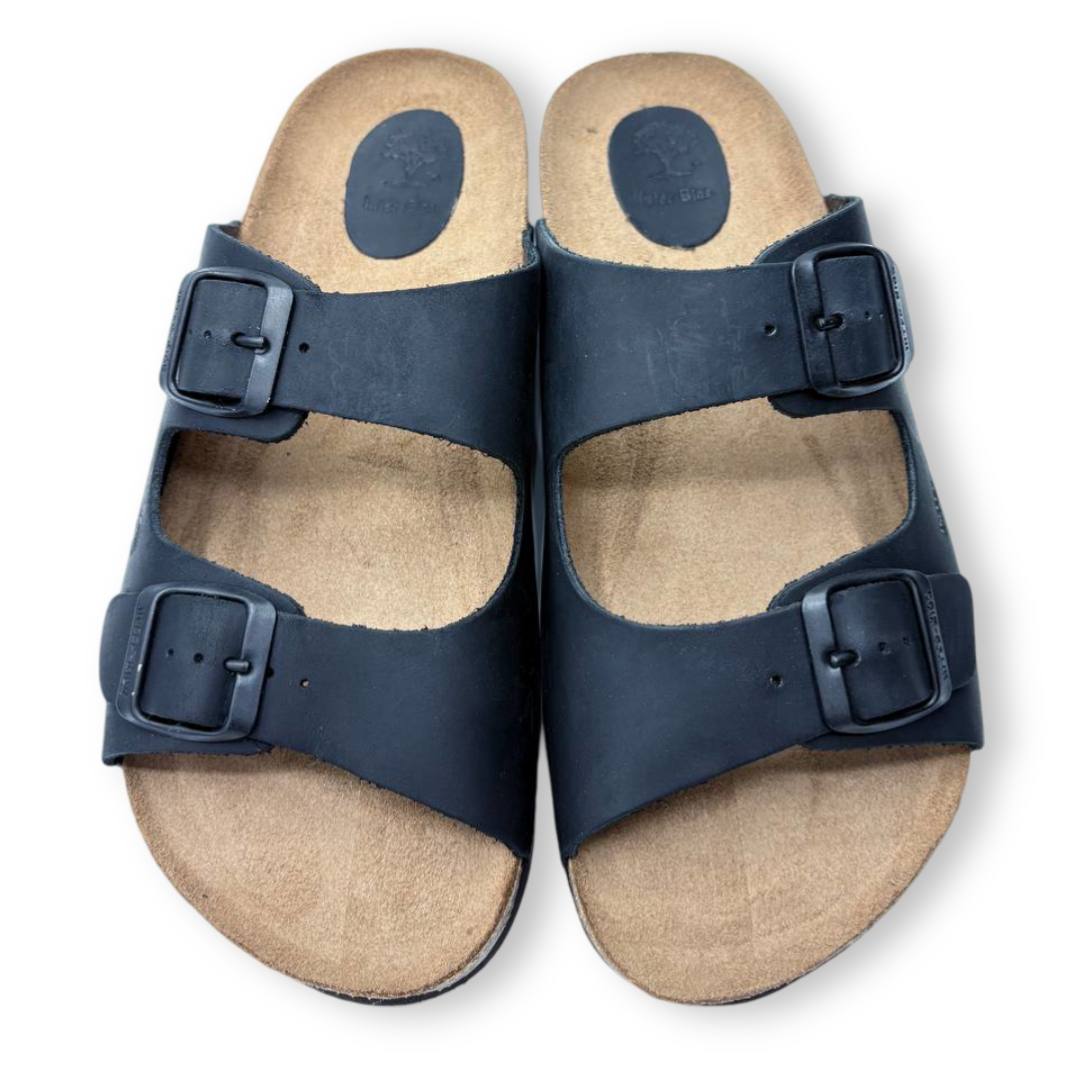 Fabricada en España con piel natural de curtido vegetal, esta sandalia bio presenta dos tiras superiores con hebillas ajustables, lo que permite adaptar el ajuste al empeine según necesidad.