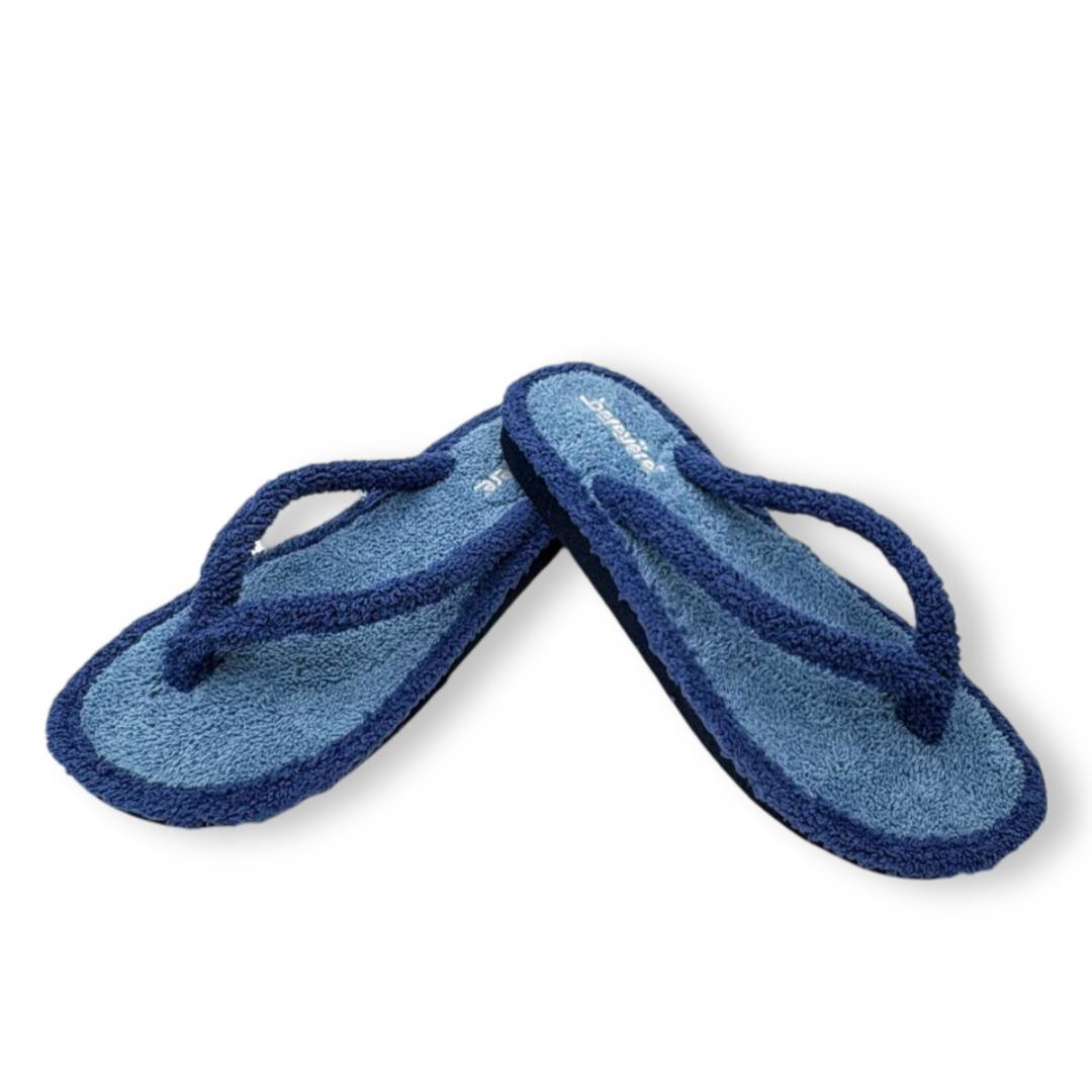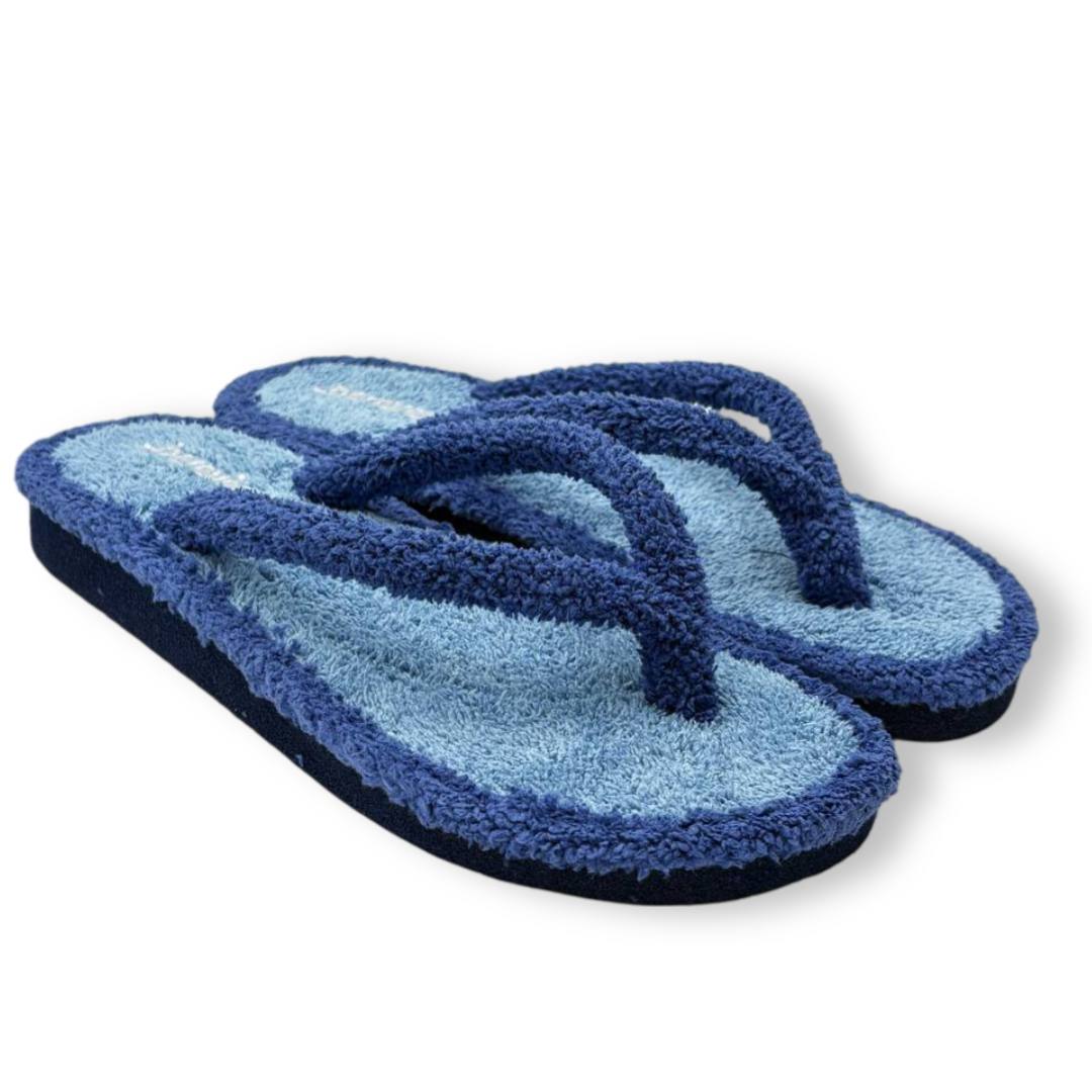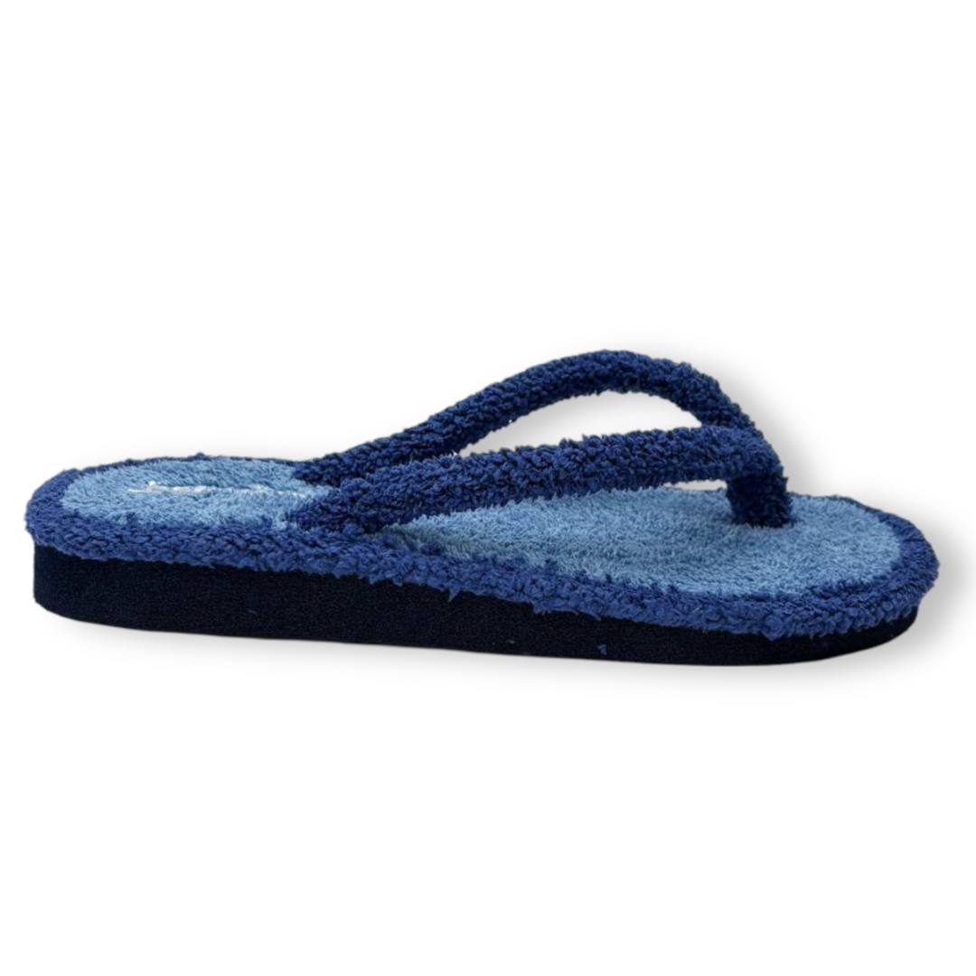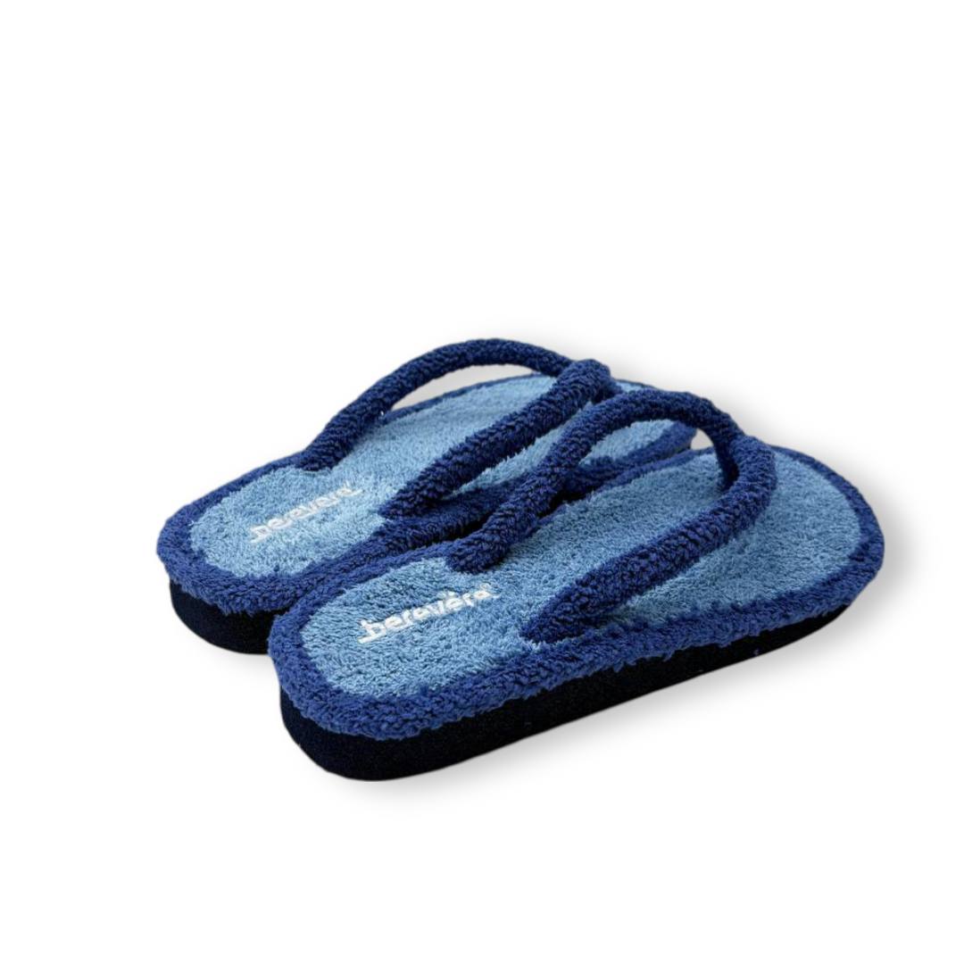 Fabricada en España, está confeccionada en suave tejido tipo rizo que garantiza una gran transpirabilidad y una sensación agradable al contacto con la piel. Su diseño tipo flip-flop con tiras acolchadas abraza el pie con suavidad, mientras que la suela ligera proporciona comodidad en cada paso, ideal para el uso prolongado en interiores.