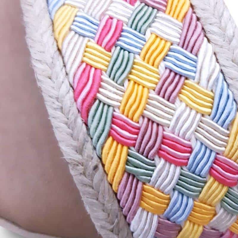 Sandalia de la marca Javier Rocha, fabricada en España con materiales de buena calidad. Exterior de piel, tiras traseras con hebilla para regular a la medida, pala delantera de rafia y entrelazado multicolor.