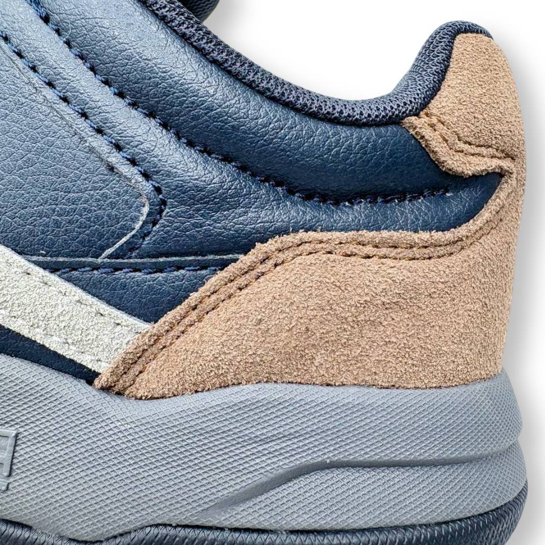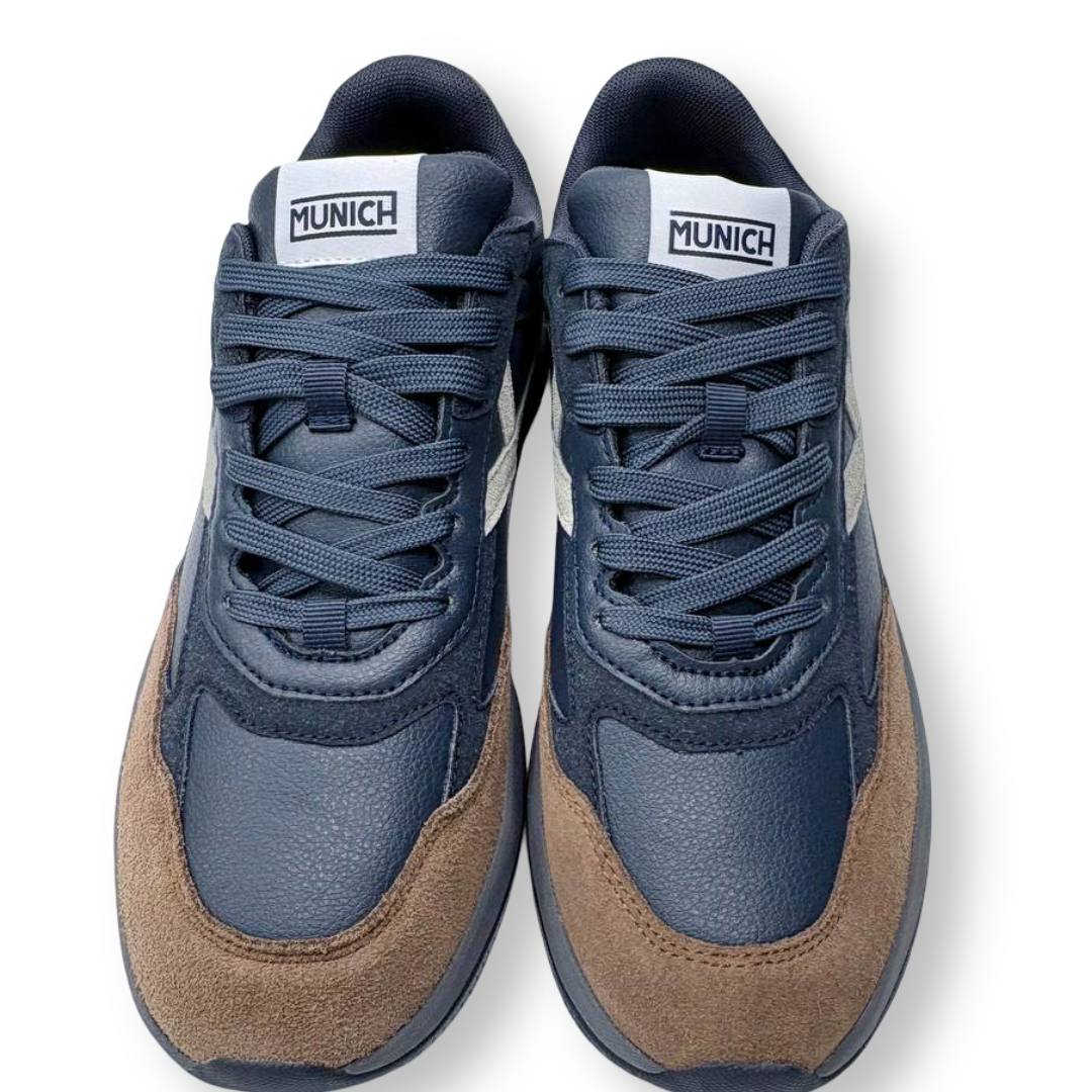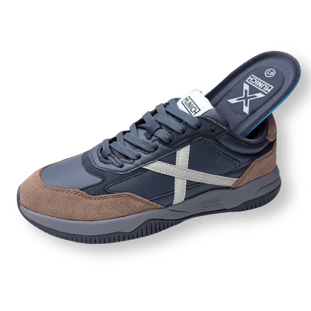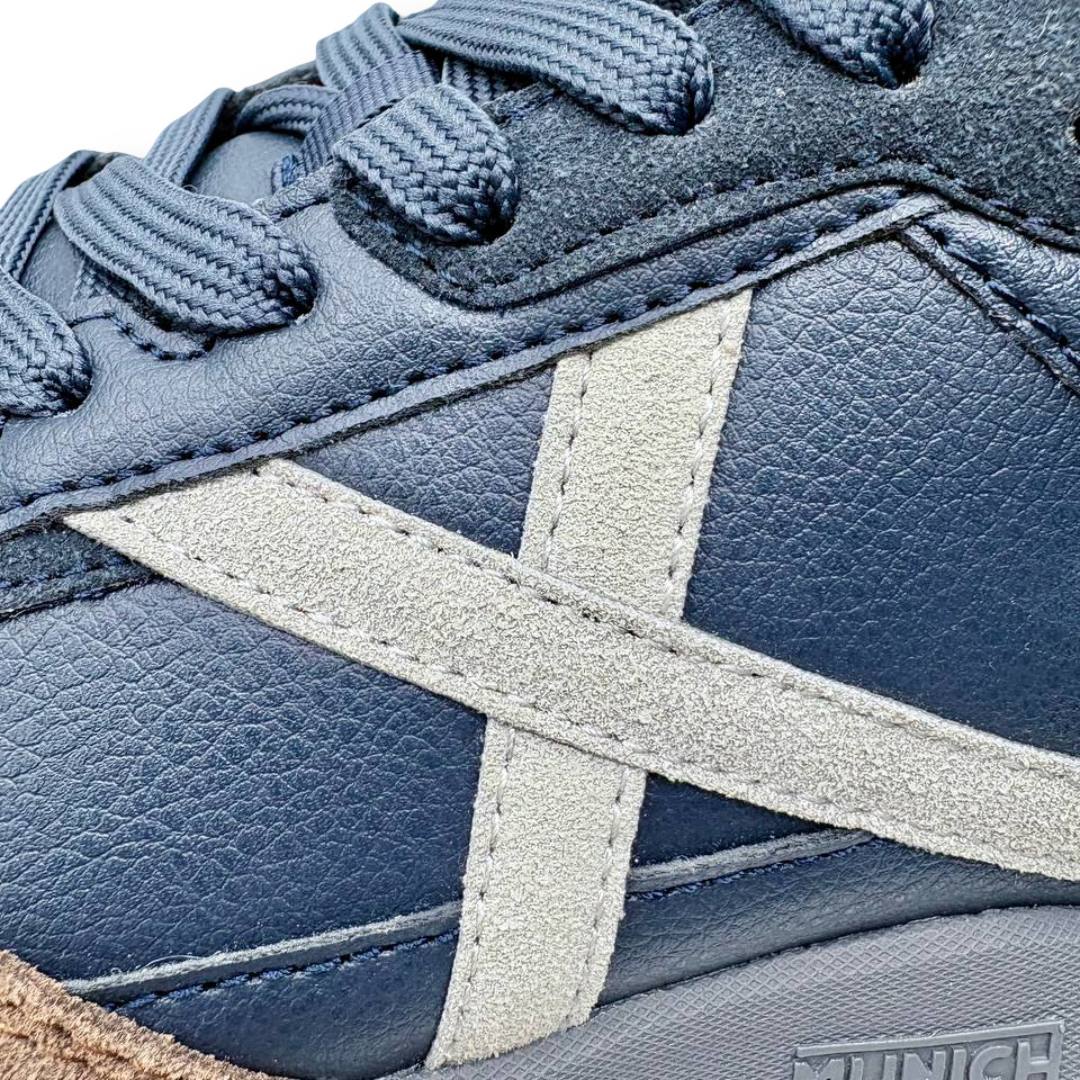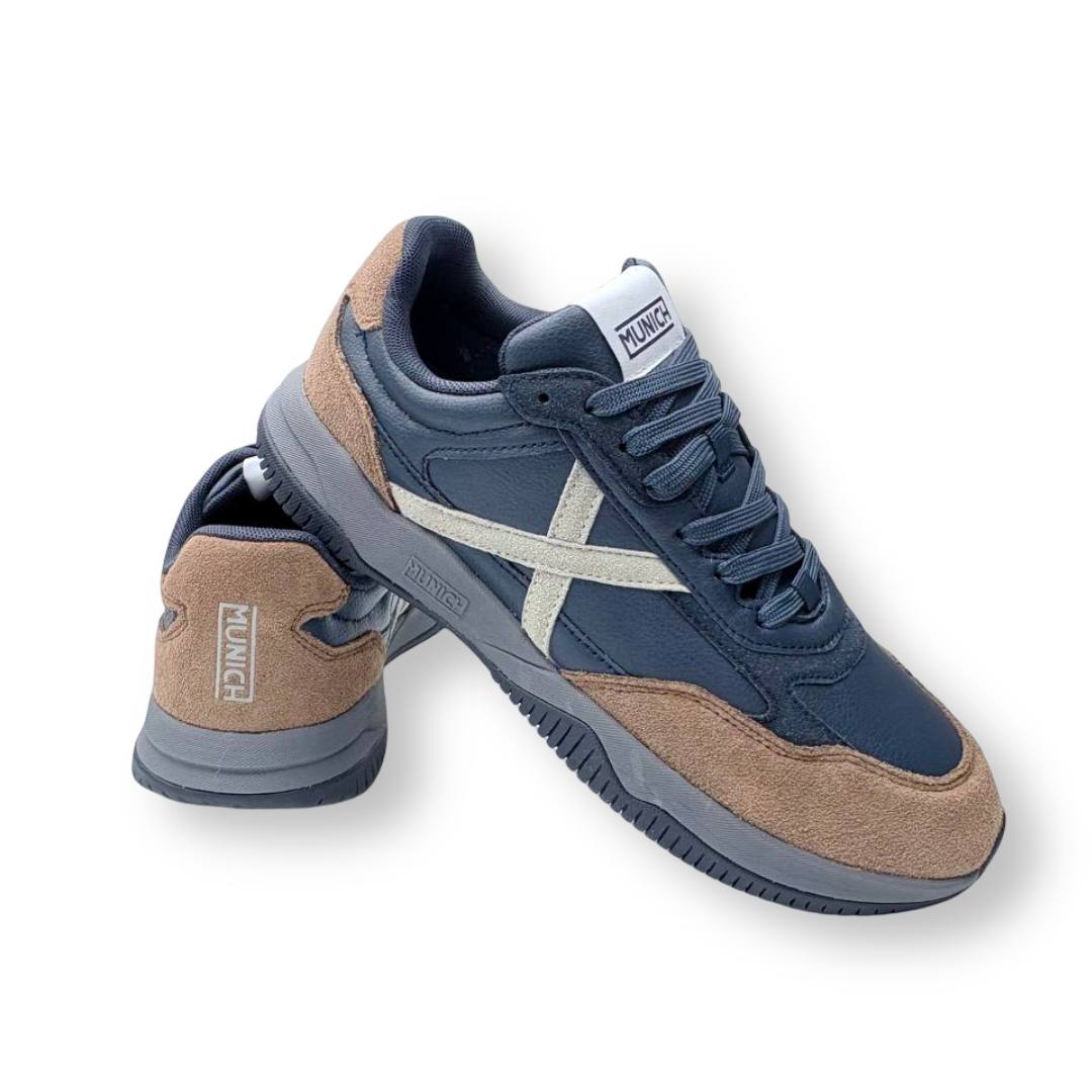 Las Munich Lyra 10 1059 son un clásico renovado dentro del calzado deportivo urbano. Su diseño combina materiales de alta calidad con una cuidada estética en tonos azul marino y beige, logrando un equilibrio perfecto entre estilo y funcionalidad. El corte superior está confeccionado en una mezcla de piel vegana y ante, ofreciendo durabilidad y una textura premium. La icónica ‘X’ lateral de Munich refuerza el carácter inconfundible de la marca.