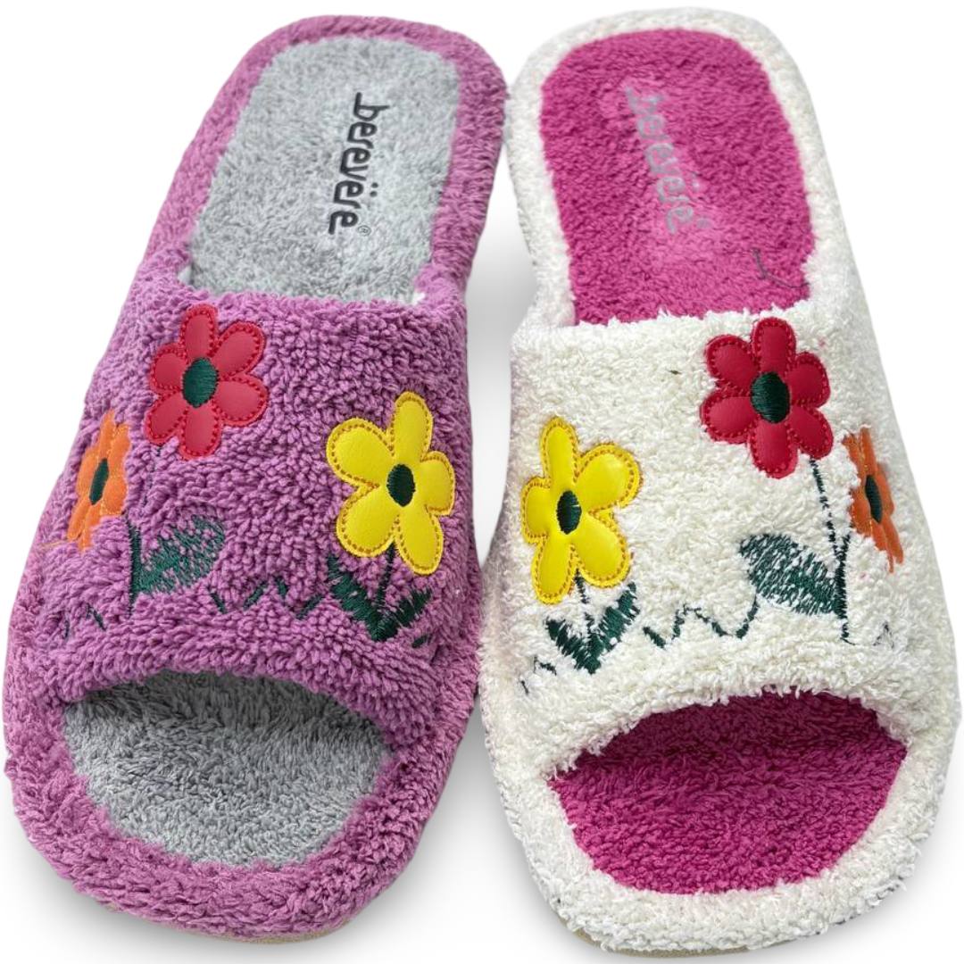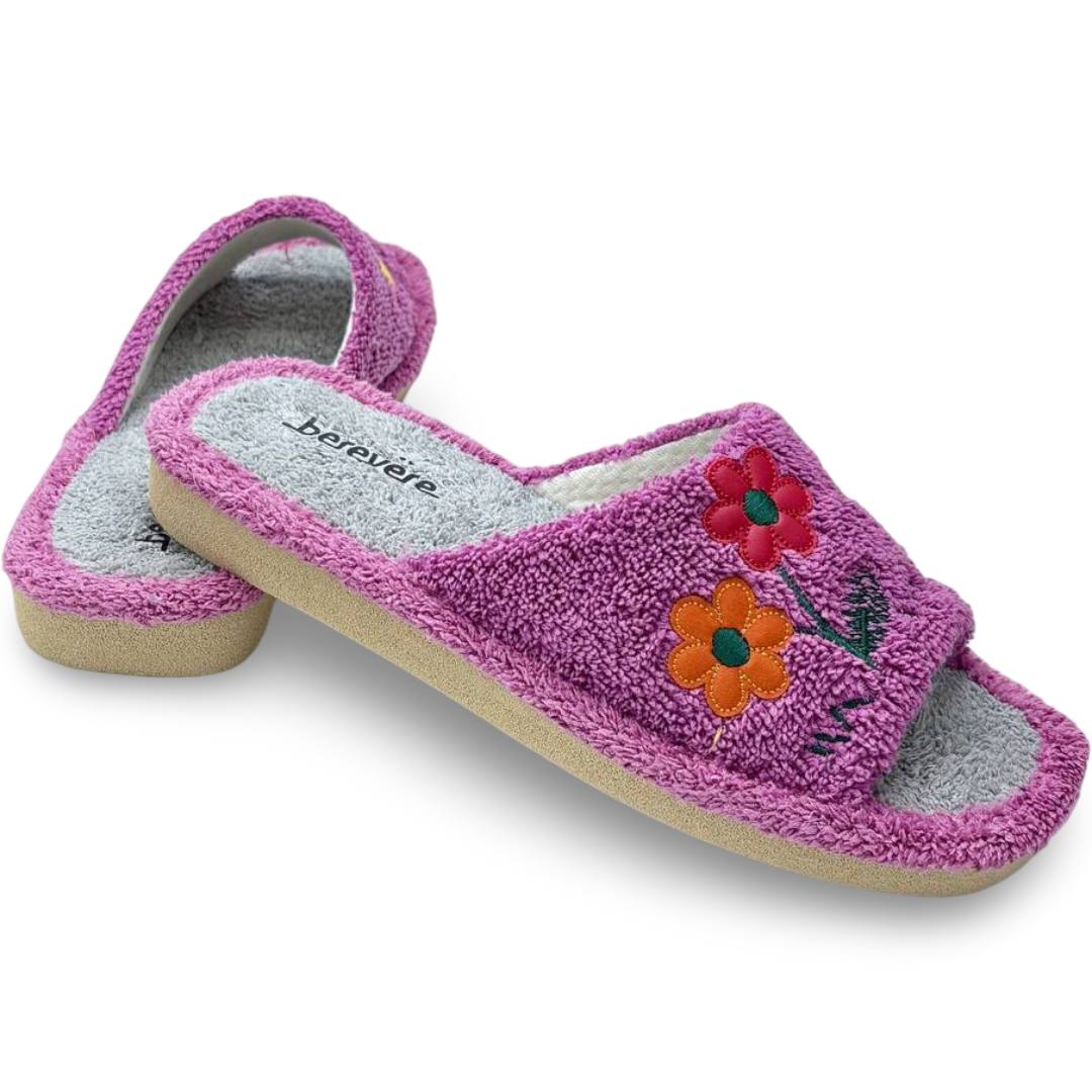 La chinela de casa Berevere V5013 en color crudo con detalles fucsia o en rosita claro y bordado de flores es una propuesta ideal para el descanso veraniego.