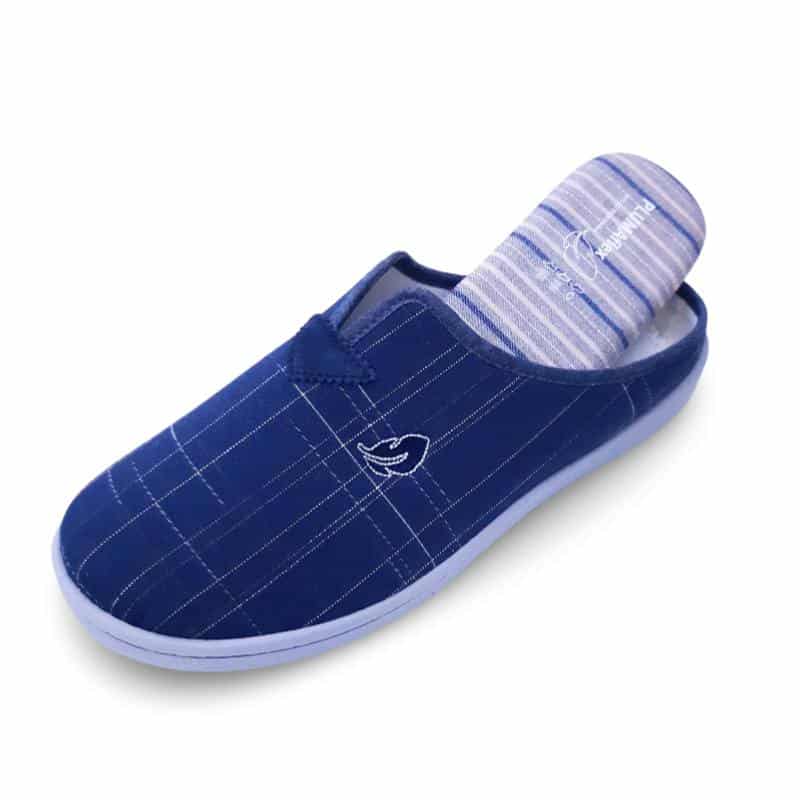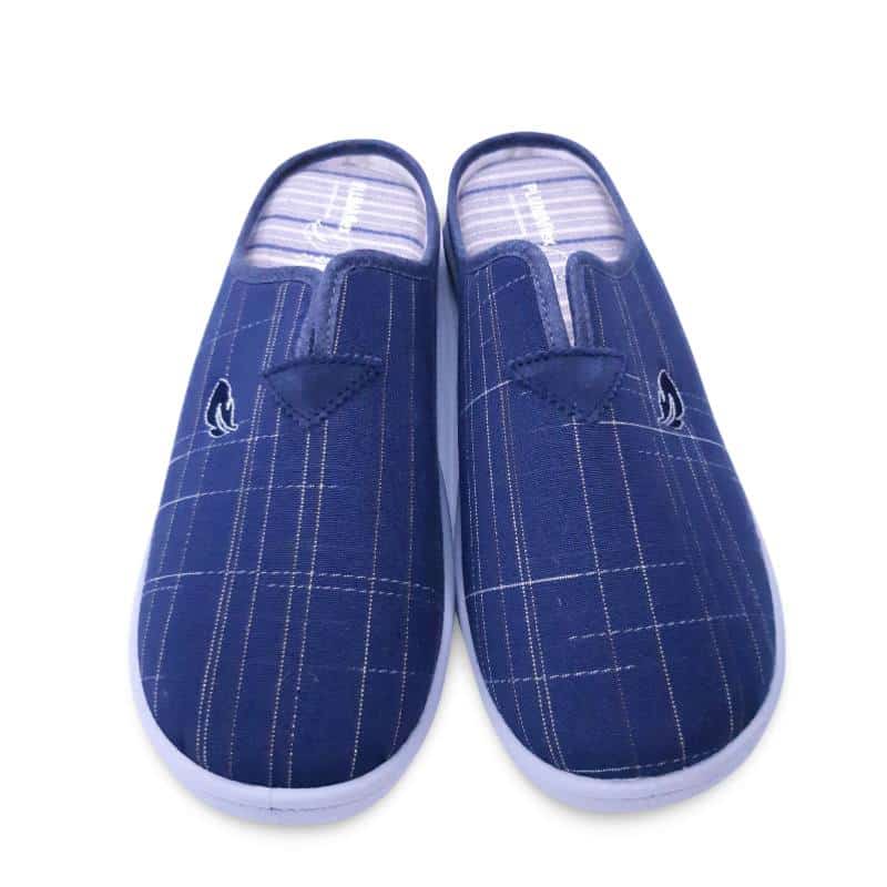 Chinela de la casa Roal, fabricada en España, con materiales de buena calidad. Toda de tela suave de color azul marino con rallas y plumas bordadas. Interior y plantilla de tela transpirable.