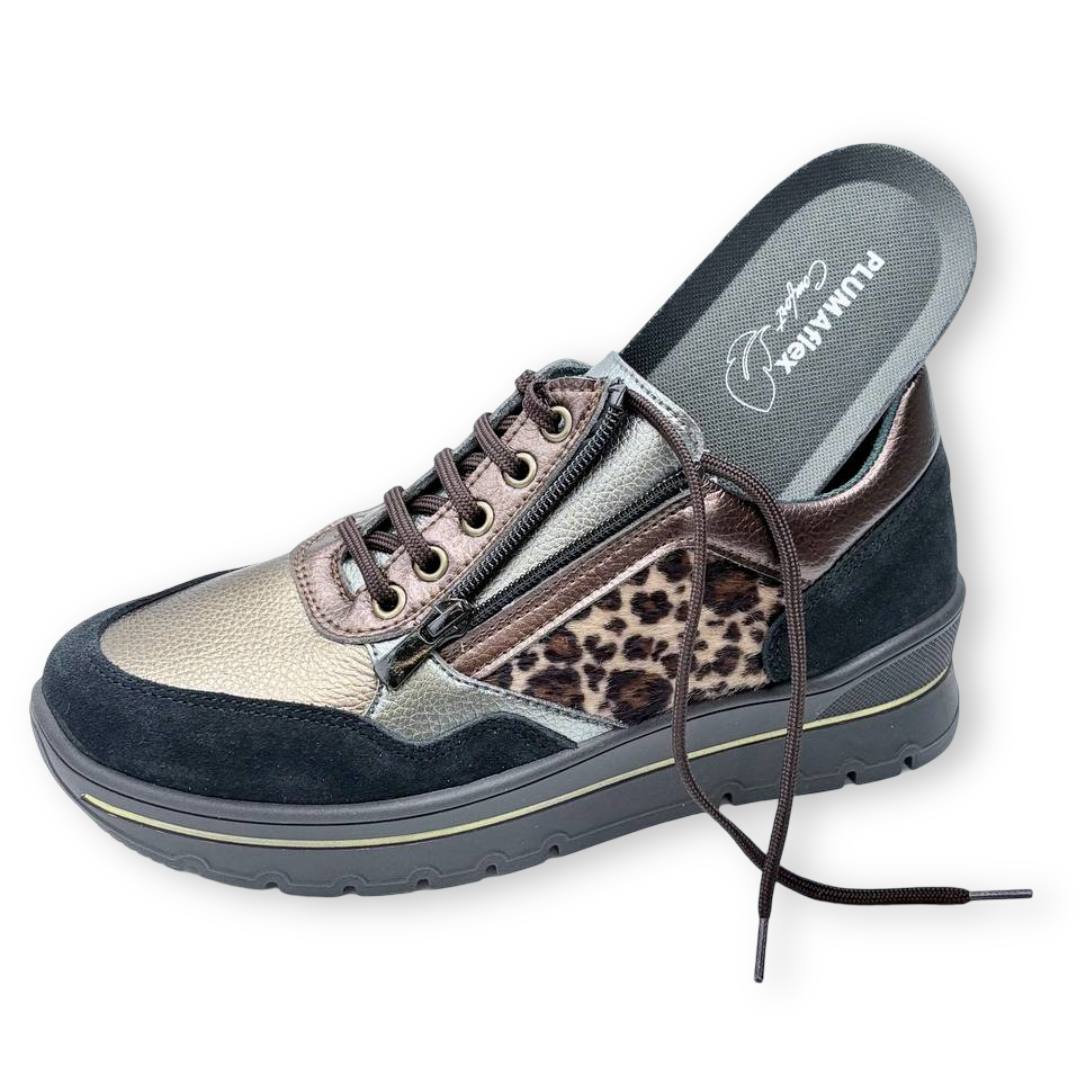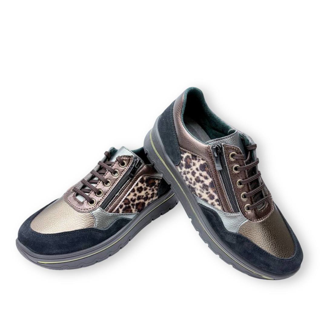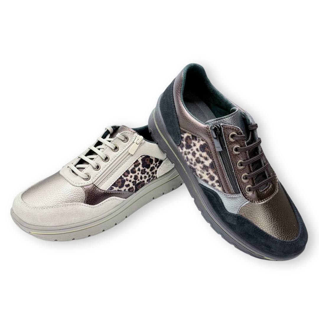 Zapatillas Calzados Roal 40026 en beige y en negro con combinado leopardo, para mujer, con cremallera lateral, cordones y plantilla acolchada extraíble. Fabricadas en material vegano transpirable con suela ligera de confort.