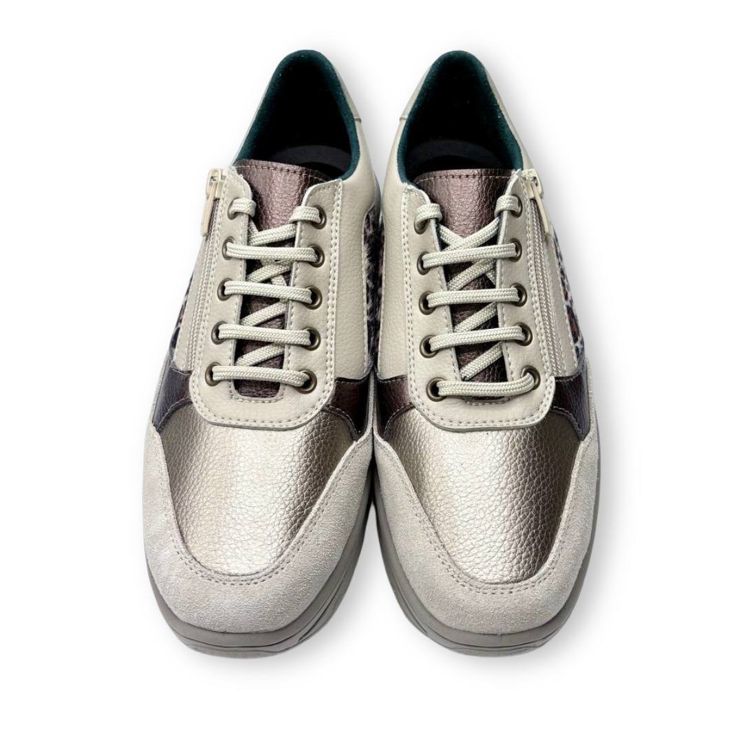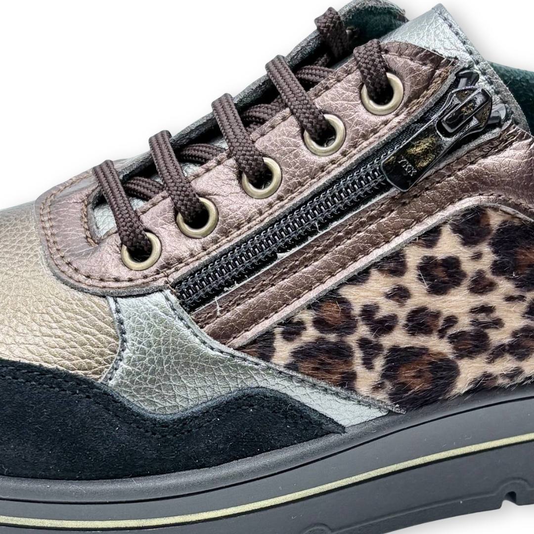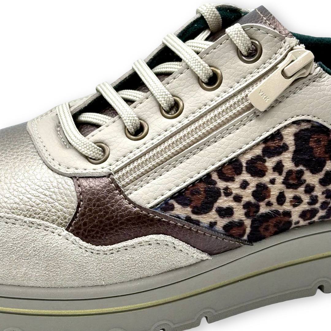 Zapatillas Calzados Roal 40026 en beige y en negro con combinado leopardo, para mujer, con cremallera lateral, cordones y plantilla acolchada extraíble. Fabricadas en material vegano transpirable con suela ligera de confort.