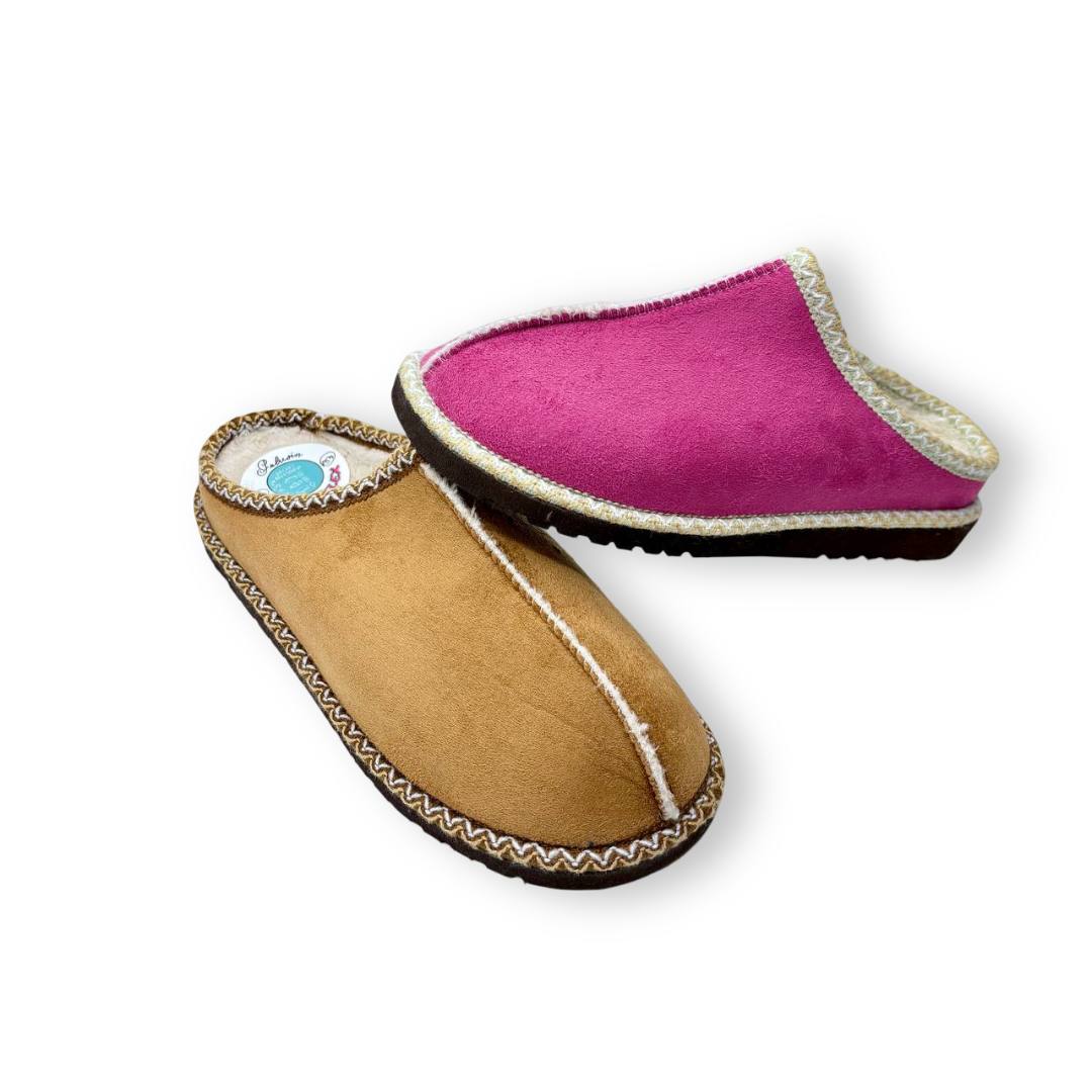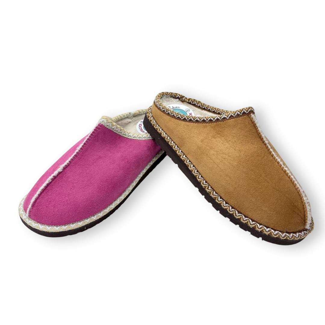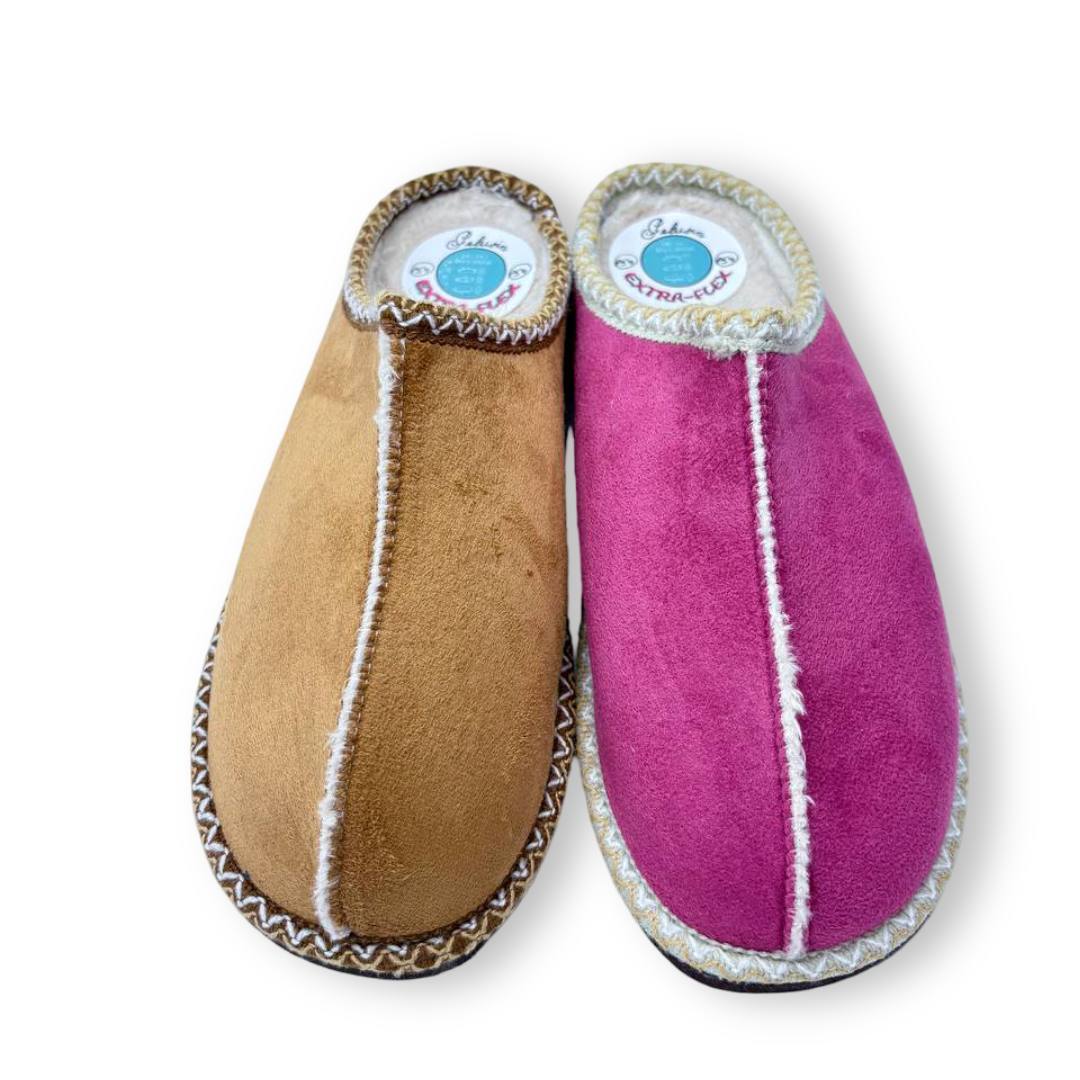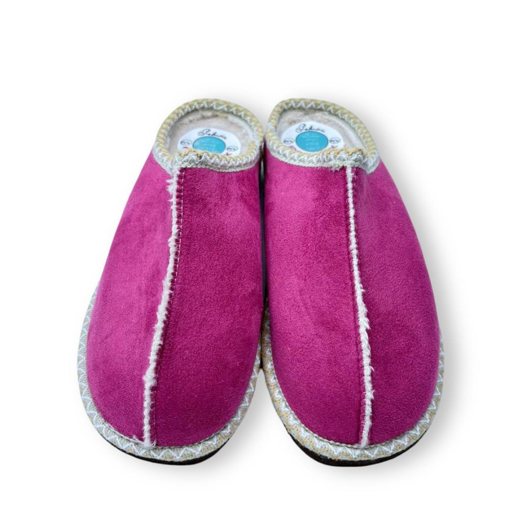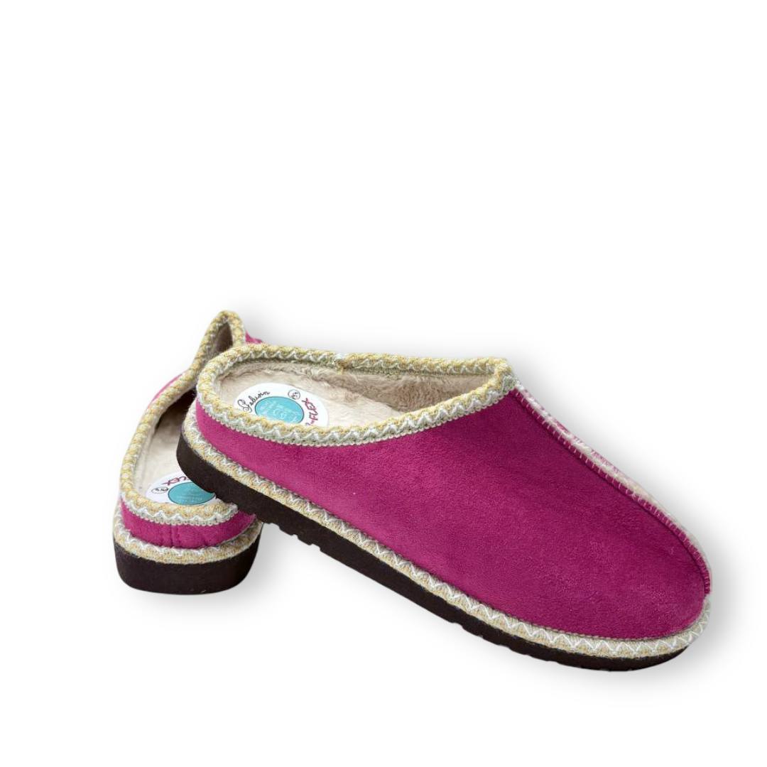 Zapatillas de casa Pelusín P100 fucsia o cuero, hechas en material tipo ante vegano con ribete artesanal. Calidez, color y confort 100 % español.