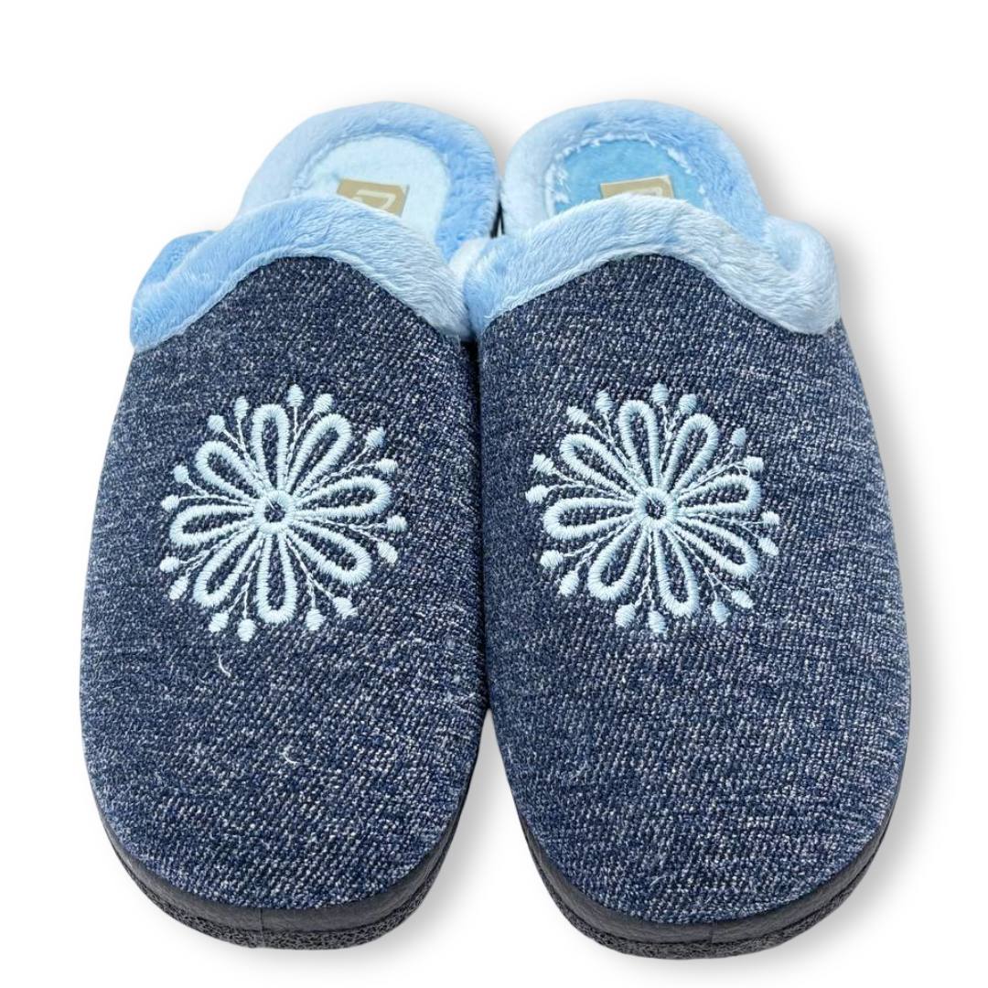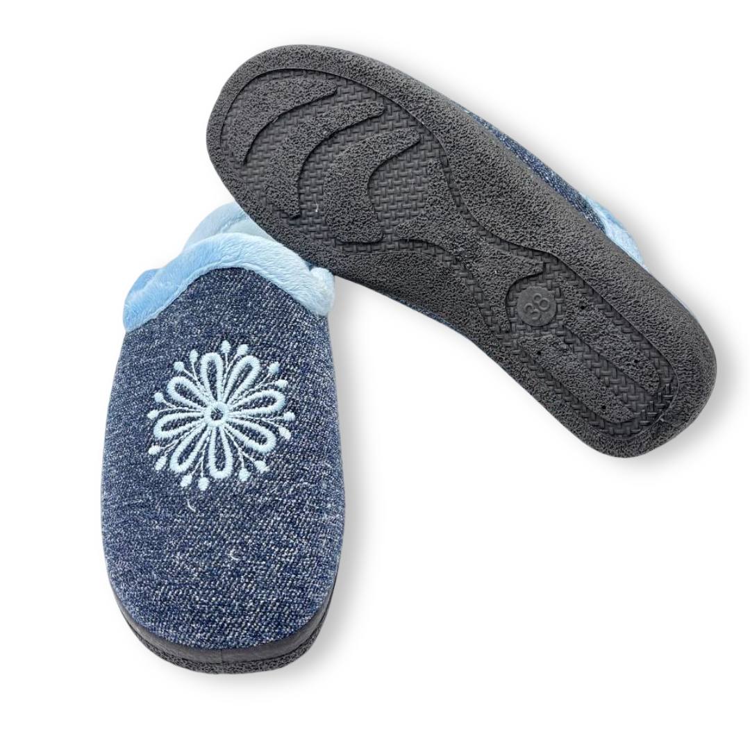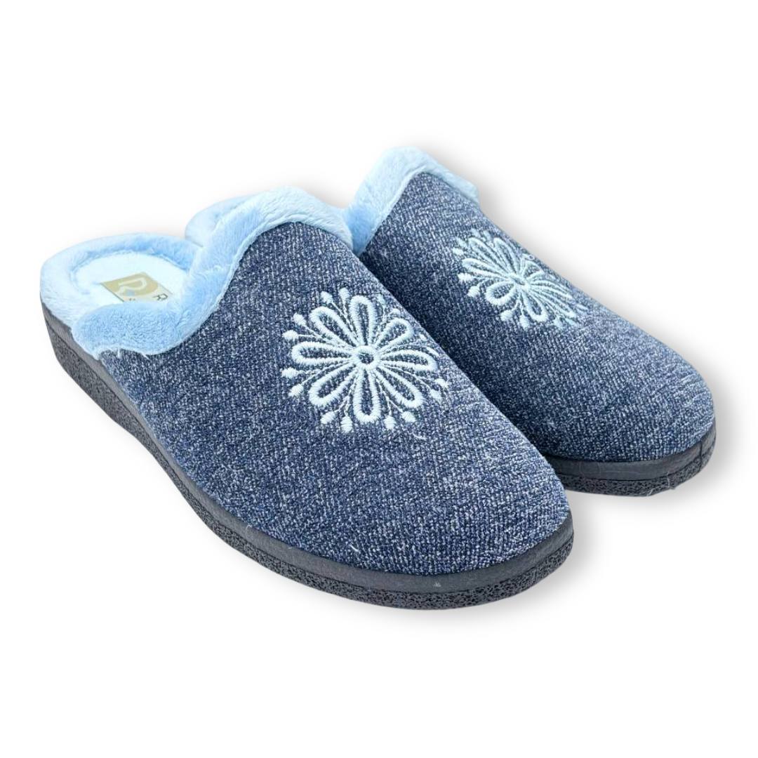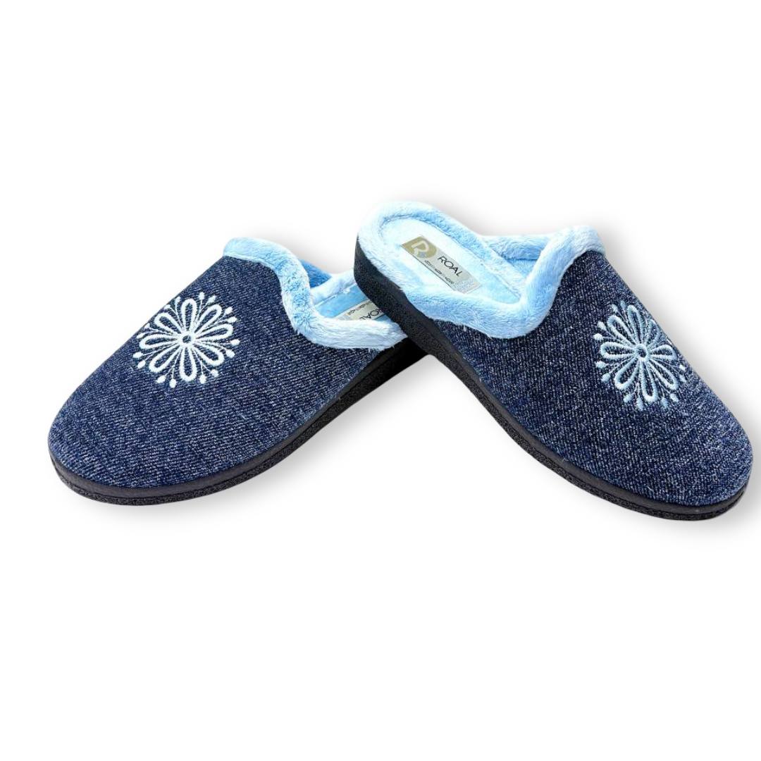 Las zapatillas ROAL 800 Azul son de paño suave muy agradable al tacto y a la vez muy abrigadoras para este tiempo de invierno. Son una chinela, abierta por detrás, de muy fácil uso. En color azul marino jaspeado con ribete de pelo suave en azul clarito y bordado de estrella de nieve en azul claro en el empeine. Su suela es de goma con un poco de cuña. Hechas en España, las Roal 800 son ideales para el invierno, reflejando el equilibrio entre diseño funcional y calidad artesanal. Una zapatilla que además de bonita es práctica, cómoda y una buena opción para el frío.