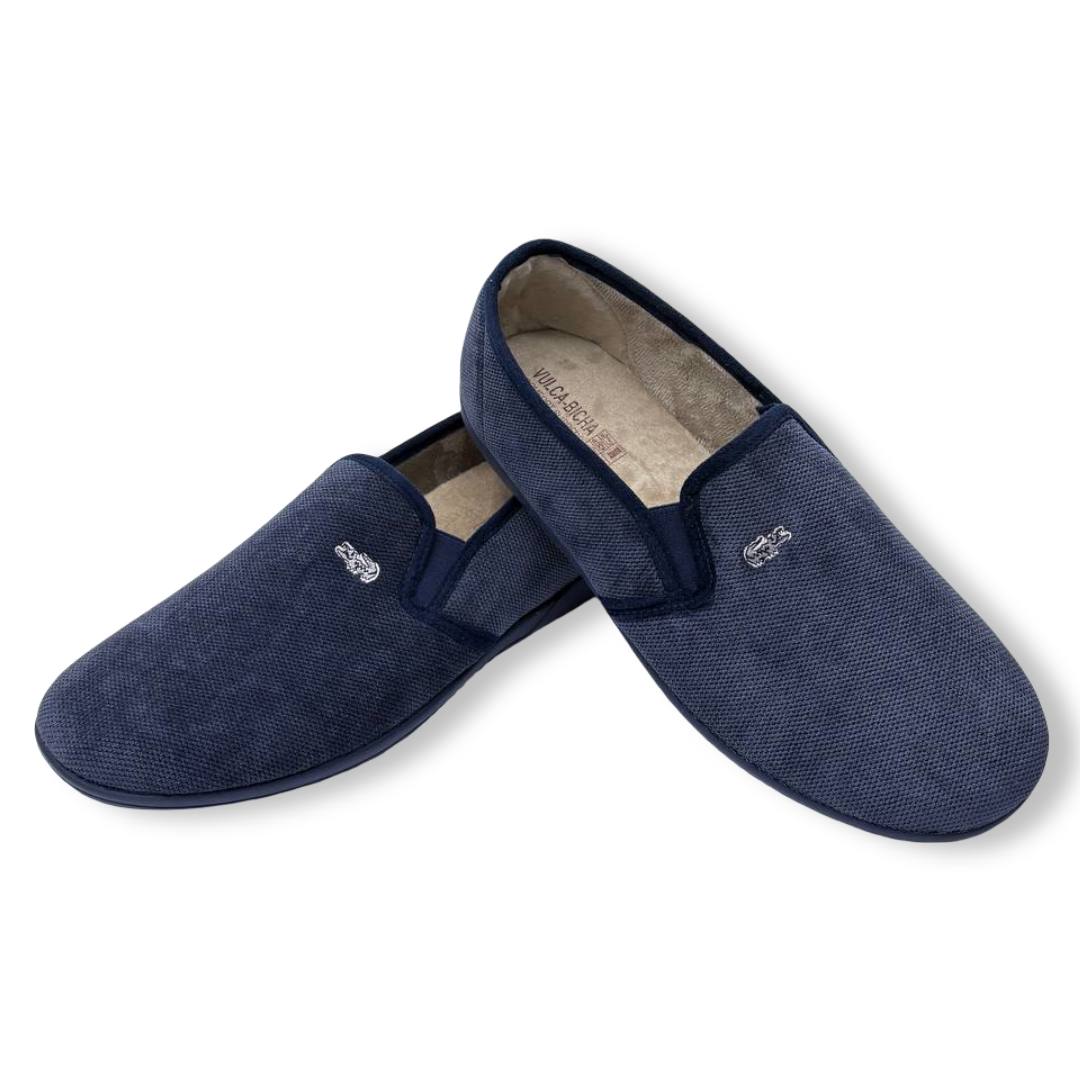 Las ZAPATILLAS DE CASA VulcaBicha 4632 en color marino están diseñadas para acompañarte con la máxima comodidad en tu día a día en el hogar. Su interior suave y agradable al tacto ayuda a mantener el calor de los pies sin agobios, ideal para los meses más fríos. La suela es ligera y antideslizante para moverse con seguridad sobre suelos lisos como parquet o baldosa, y la construcción flexible permite un movimiento natural del pie. El corte exterior está confeccionado con materiales de fácil mantenimiento, pensados para resistir el uso diario sin perder forma.