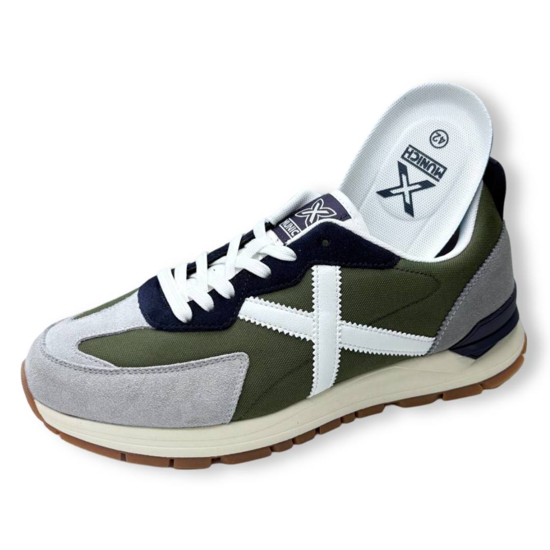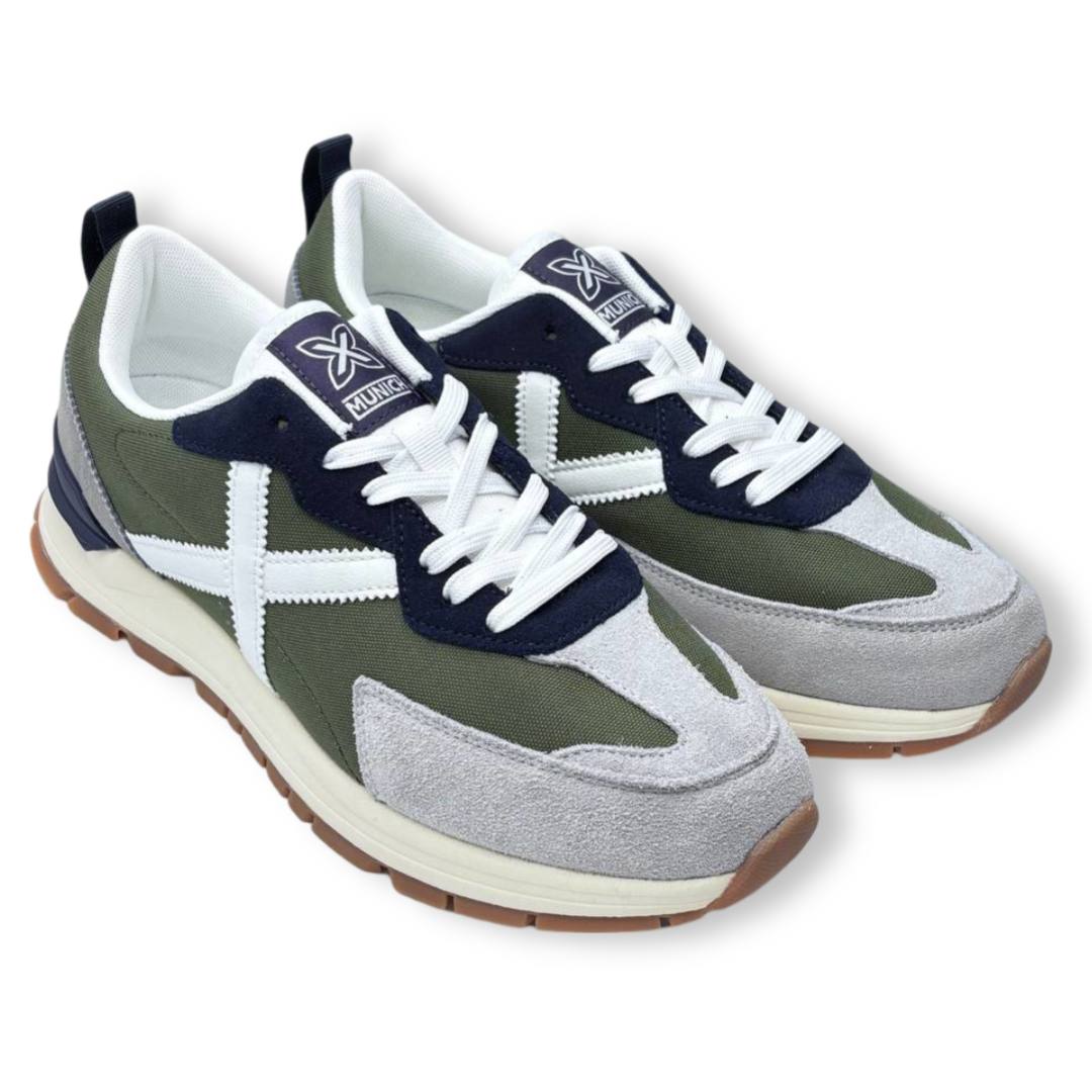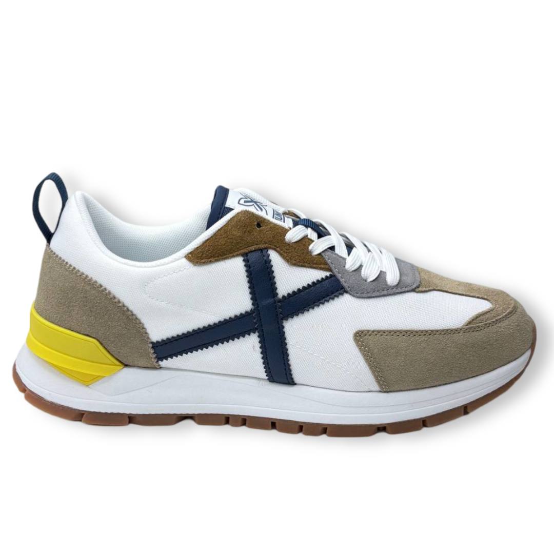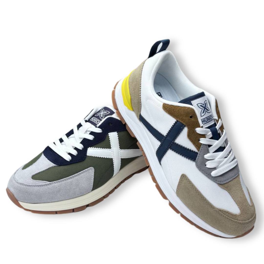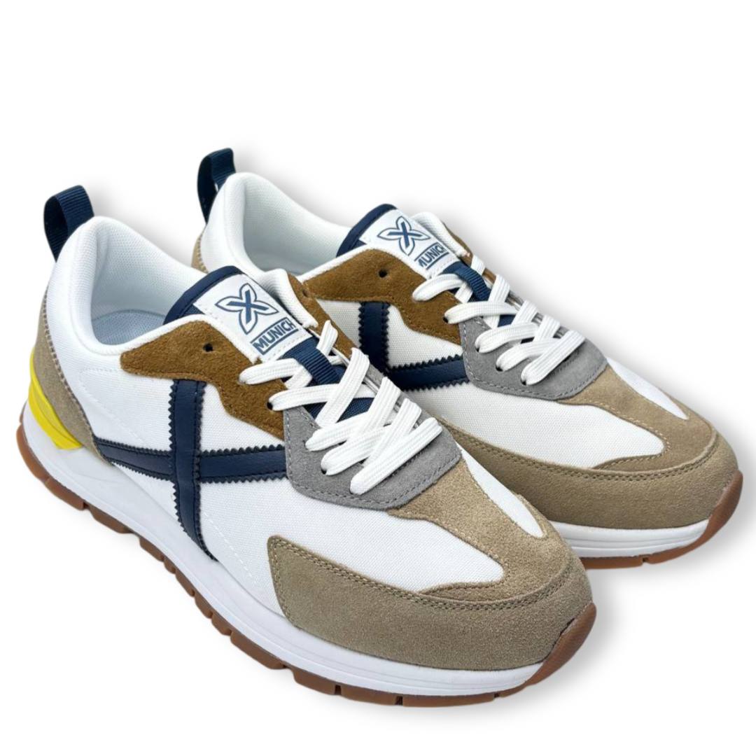 Las Munich Versatile en Verde y Blanco destacan por su diseño moderno y versátil en tonos blanco, azul marino y beige con detalles en amarillo. Estas zapatillas ofrecen comodidad gracias a su fabricación con materiales transpirables y suela amortiguada.