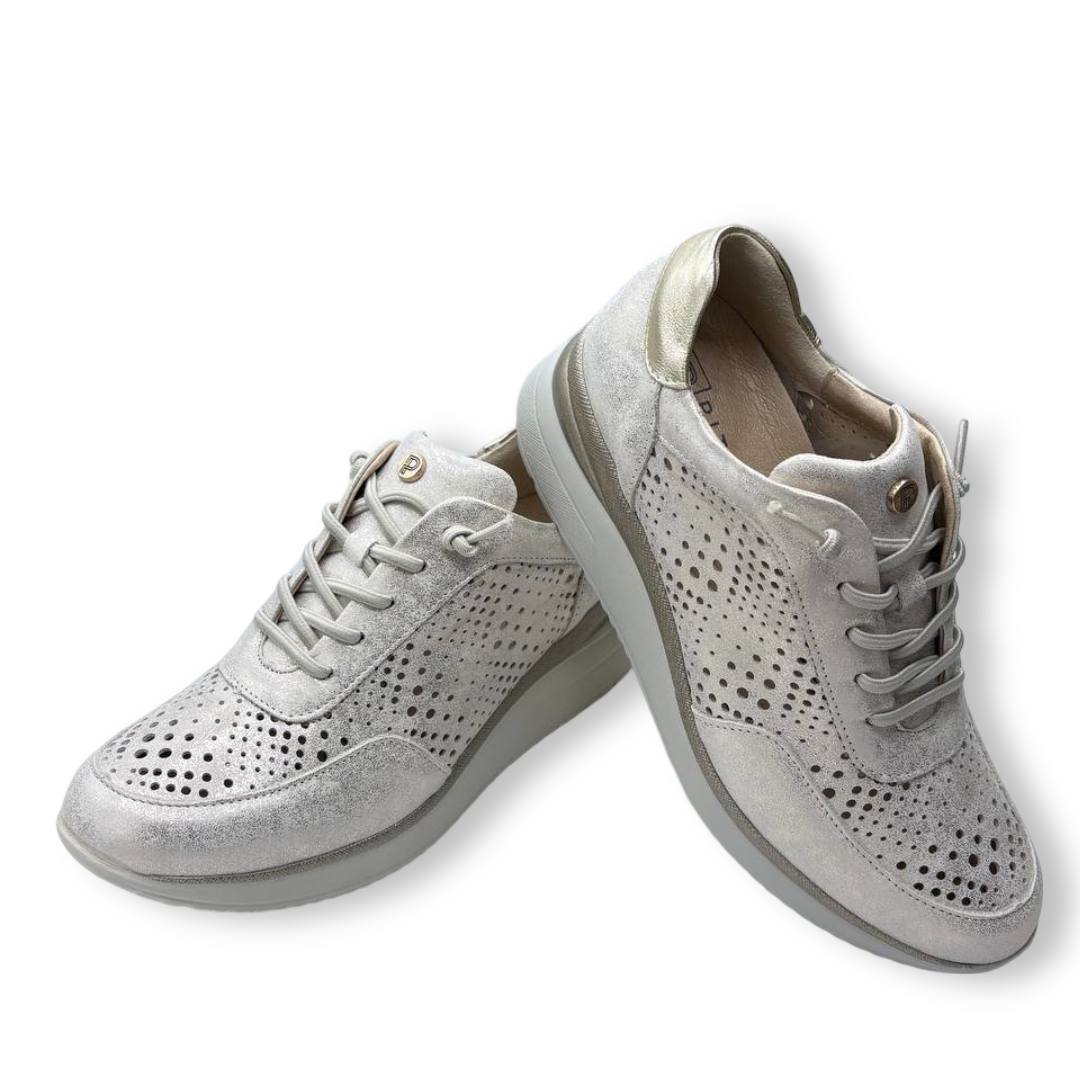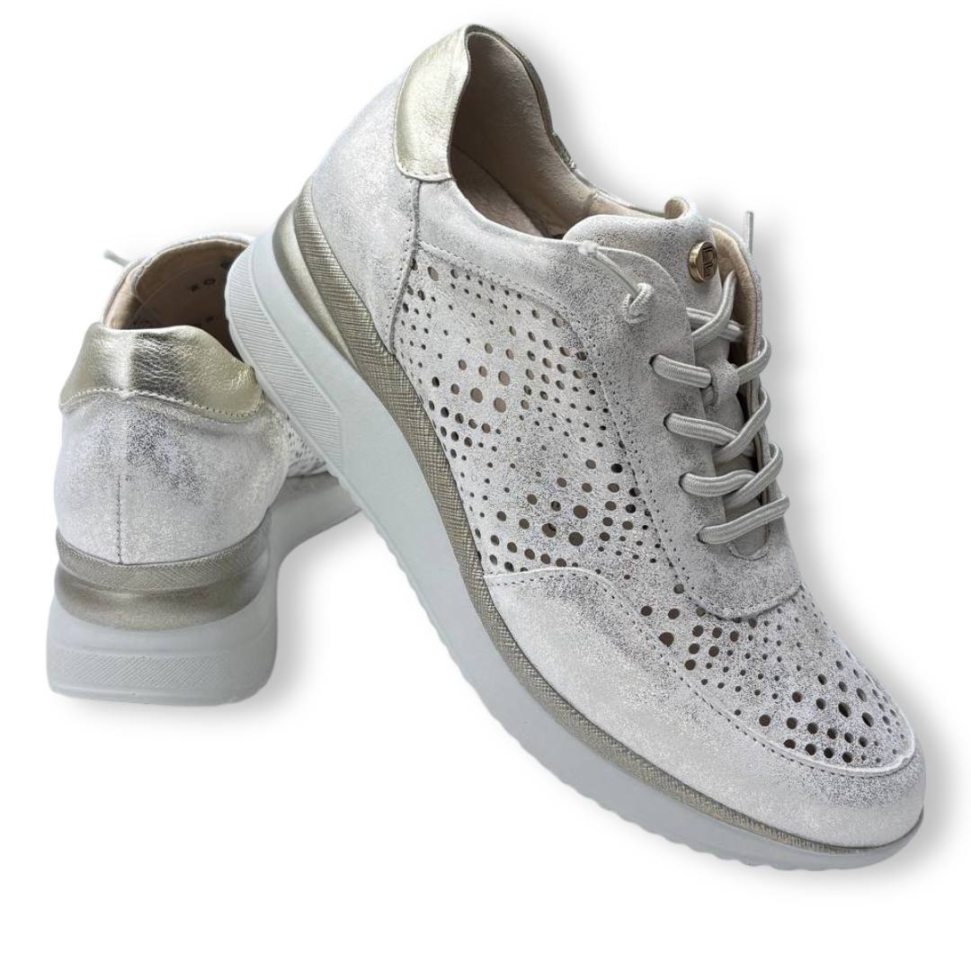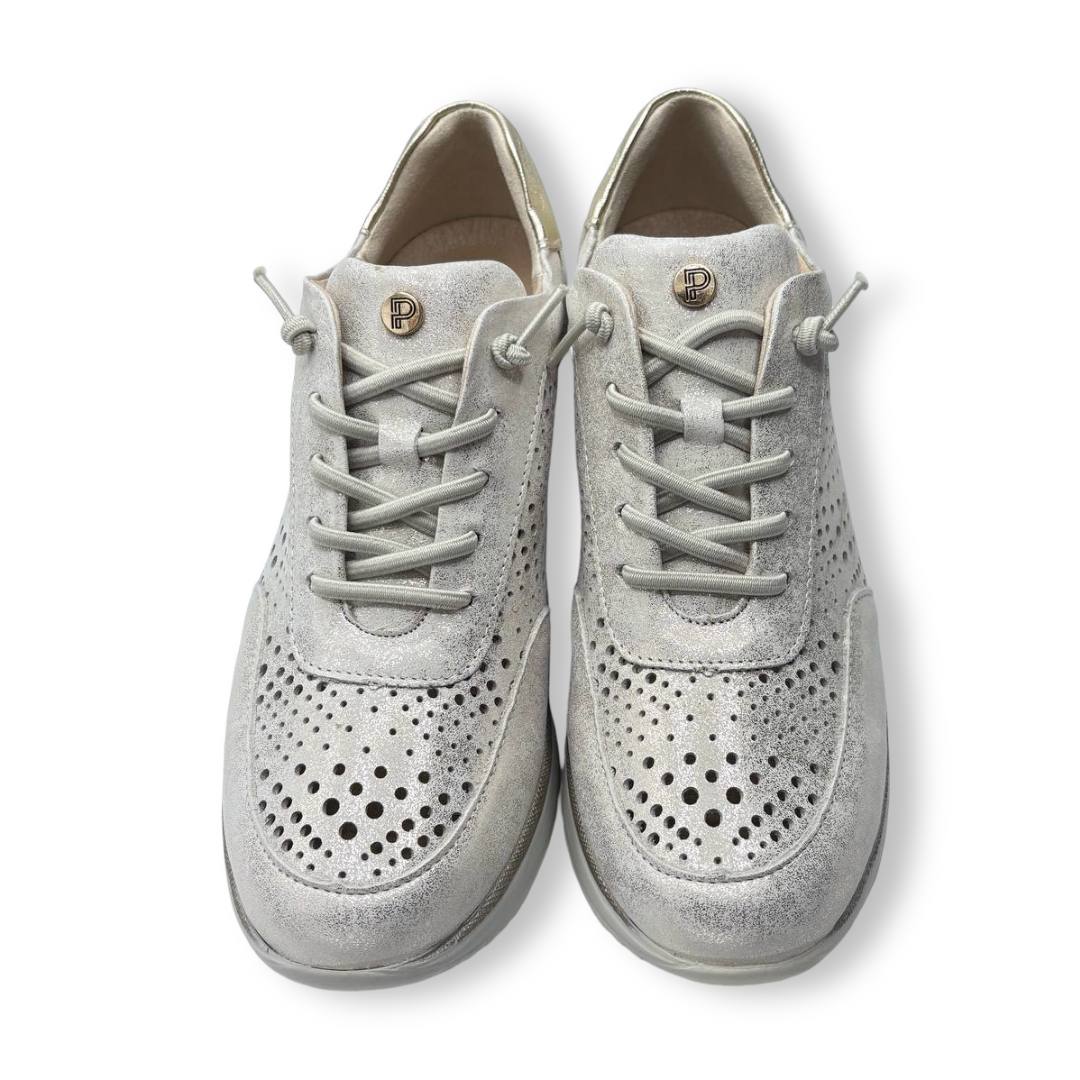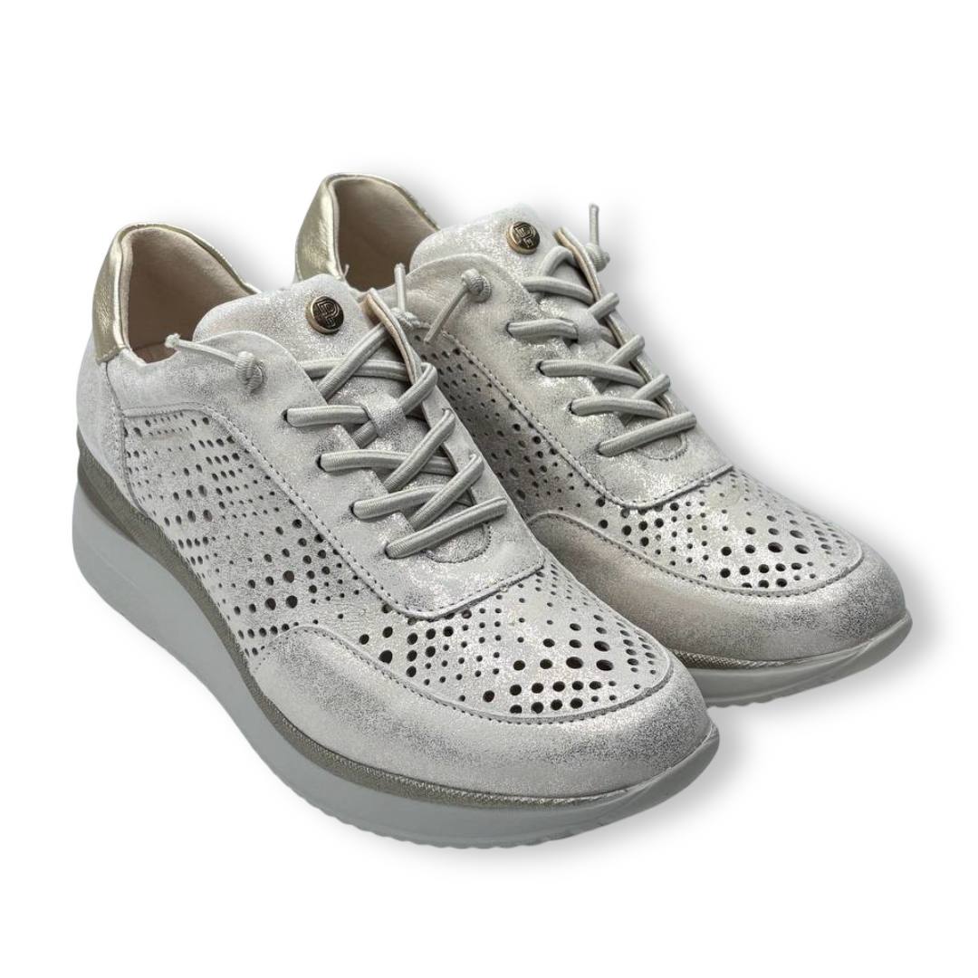 Este zapato deportivo mantiene una línea refinada gracias a los toques metalizados y acabados sutiles que lo hacen compatible tanto con atuendos casuales como con looks más formales. Perfecto para combinar con pantalones, faldas o vestidos informales, es un modelo muy versátil para el armario femenino.