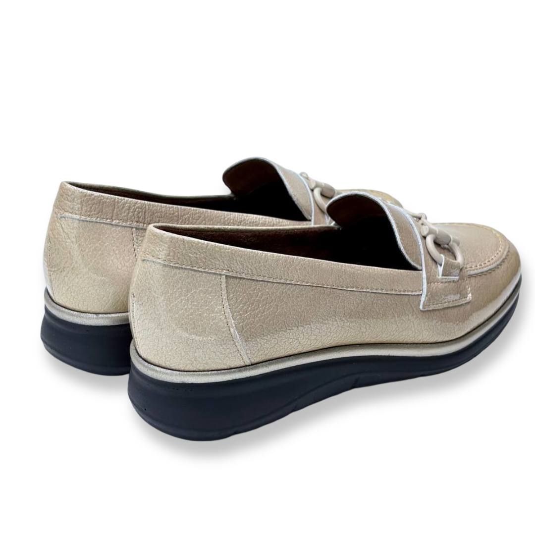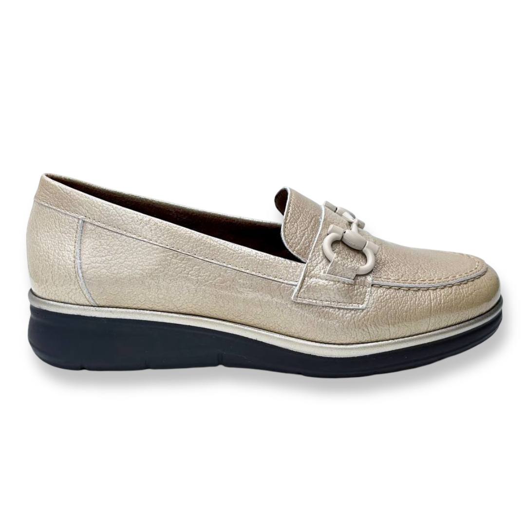 Además su diseño de mocasín con detalle de metal en el empeine es minimalista, dandolé un aspecto muy elegante. Incorpora una suela flexible y ligera, con un poquito de plataforma, ideal para caminar largas distancias sin fatiga, y un forro interior suave y transpirable que cuida el pie. Este zapato versátil combina con cualquier look urbano o informal, ofreciendo una excelente relación entre confort y elegancia.