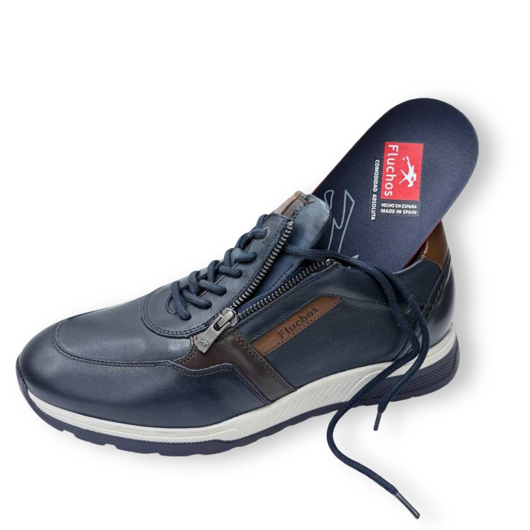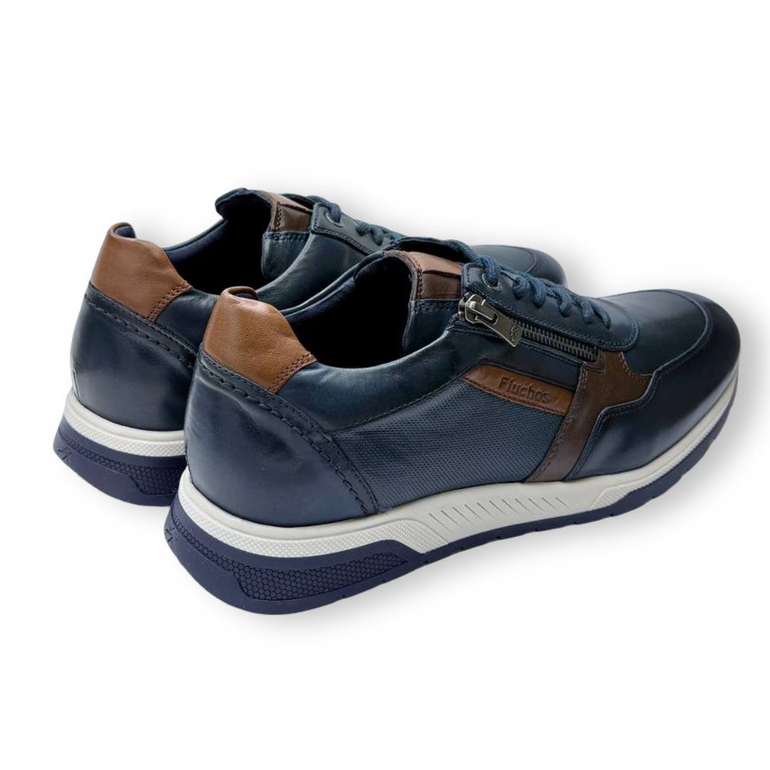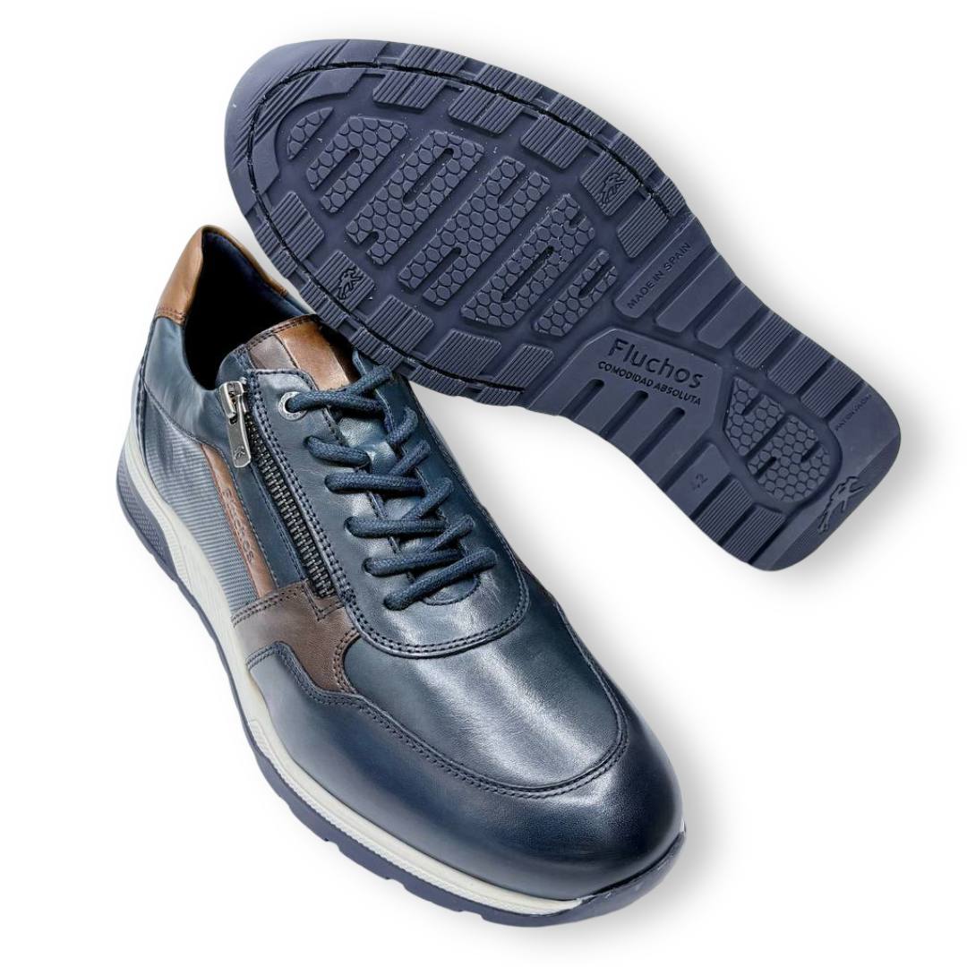 El zapato sport Fluchos Louis F1600 está disponible en dos colores: marrón y azul marino. Confeccionado en piel de alta calidad, este modelo ofrece un diseño casual con detalles sofisticados, como sus costuras resistentes y un sistema de cierre que combina cordones y cremallera lateral, lo que facilita la puesta de manera rápida y cómoda.