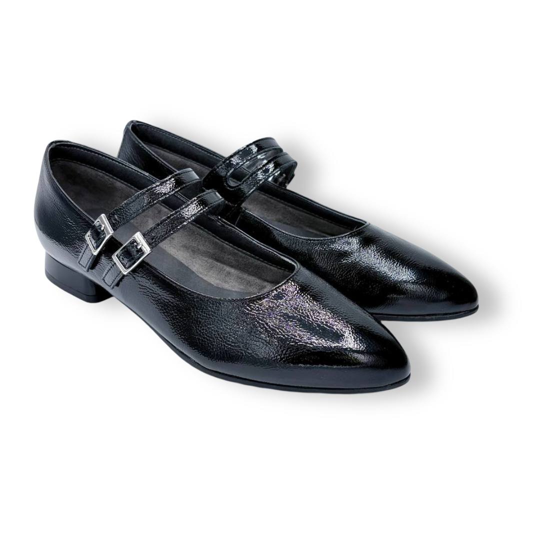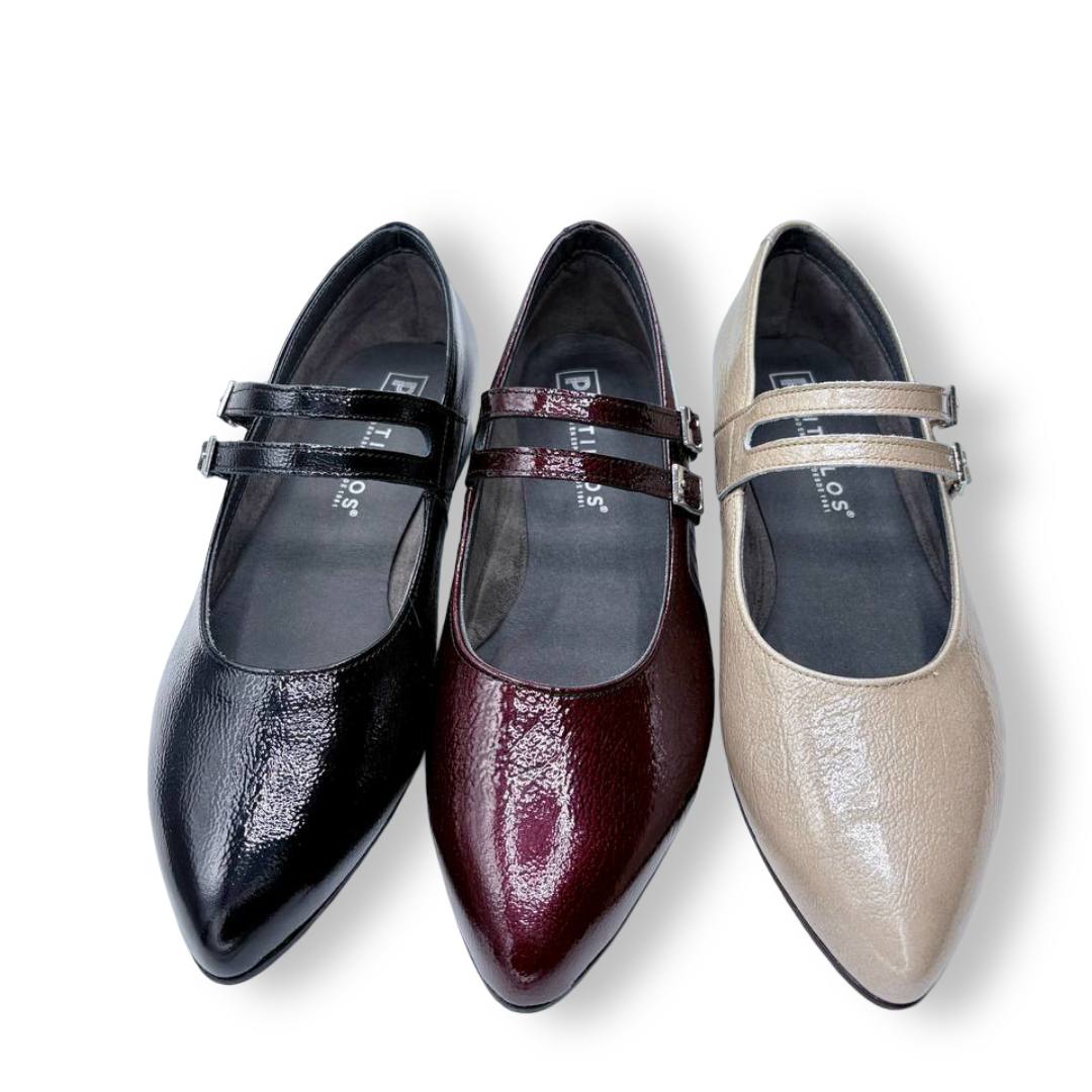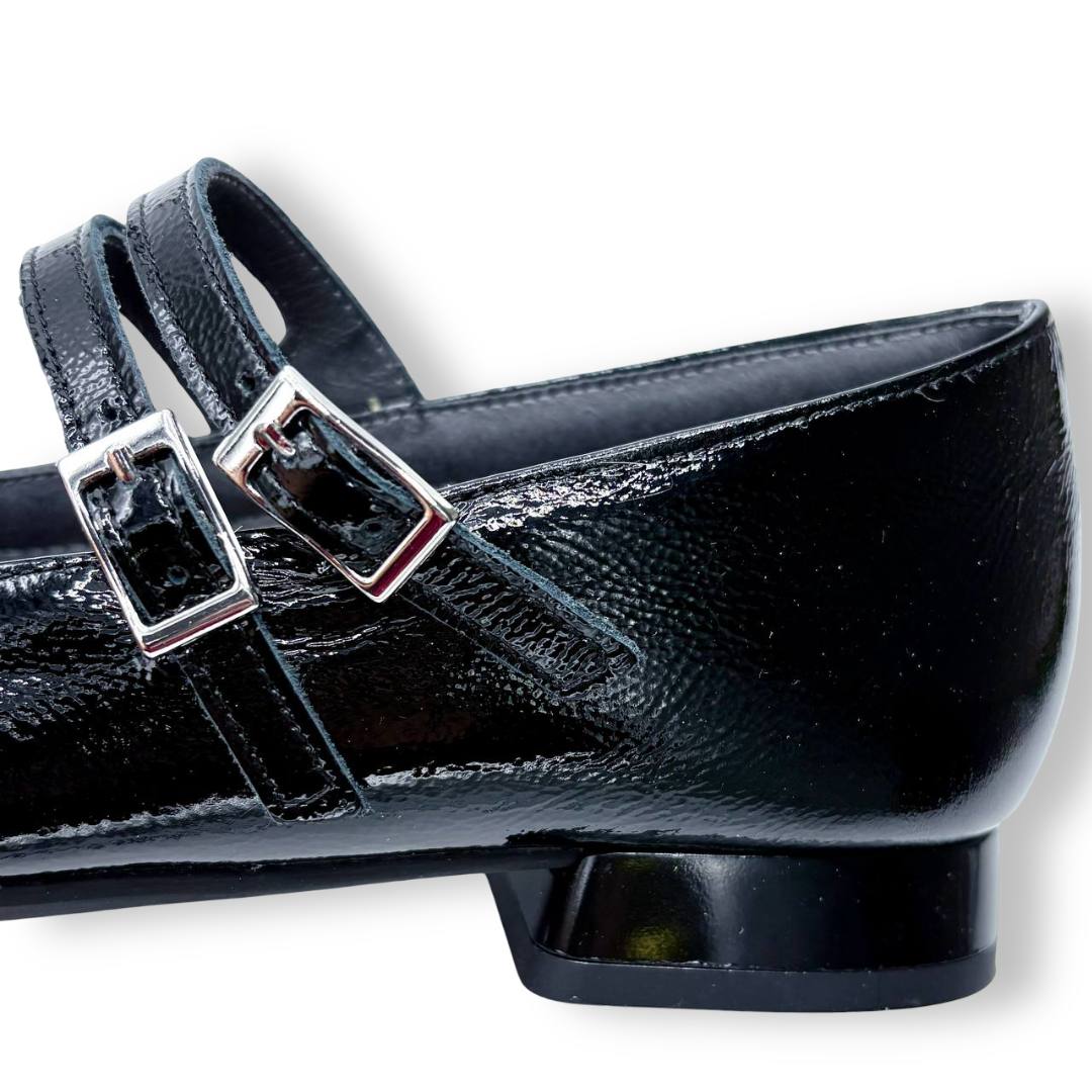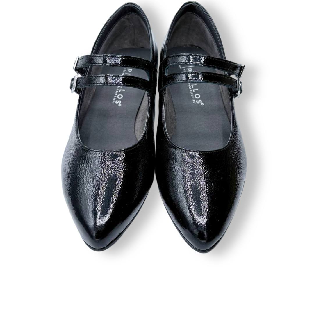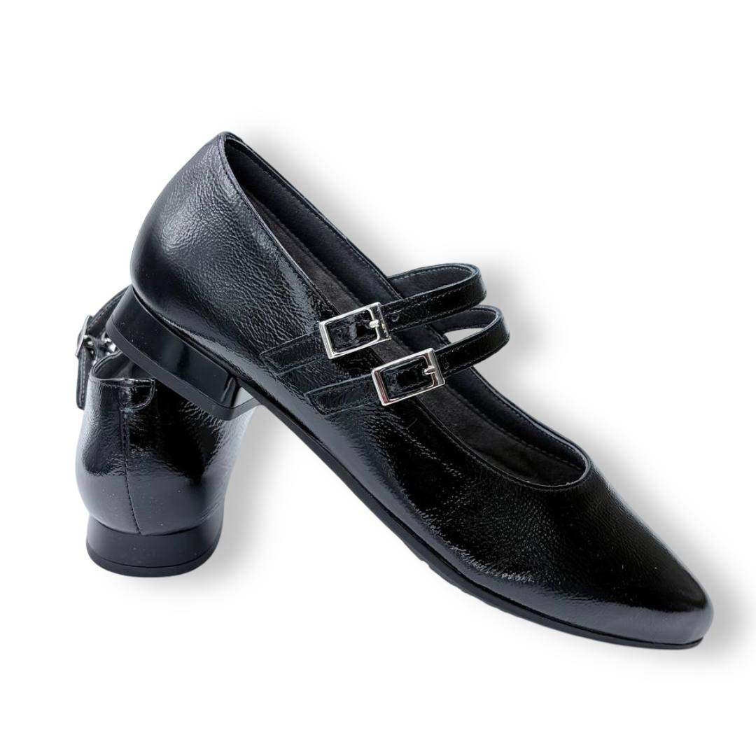 En las fotos se aprecia el acabado tipo charol con textura fina y dos tiras finas sobre el empeine, cada una con hebilla metálica regulable para mejorar el ajuste. La puntera es alargada con redondeo y el tacón es bajo y estable, ideal para caminar muchas horas sin fatiga.
