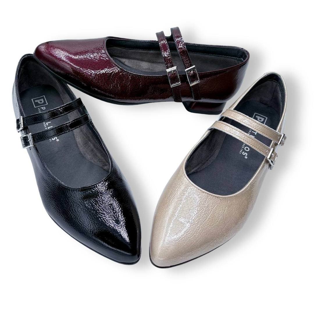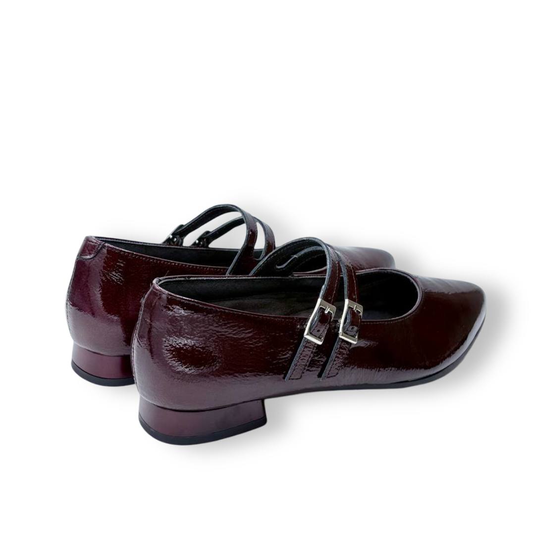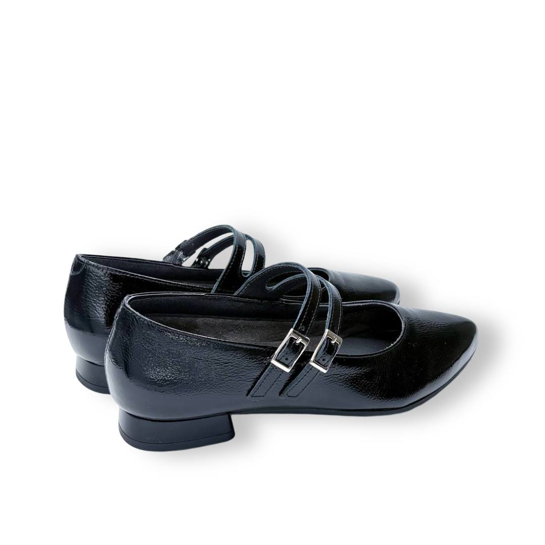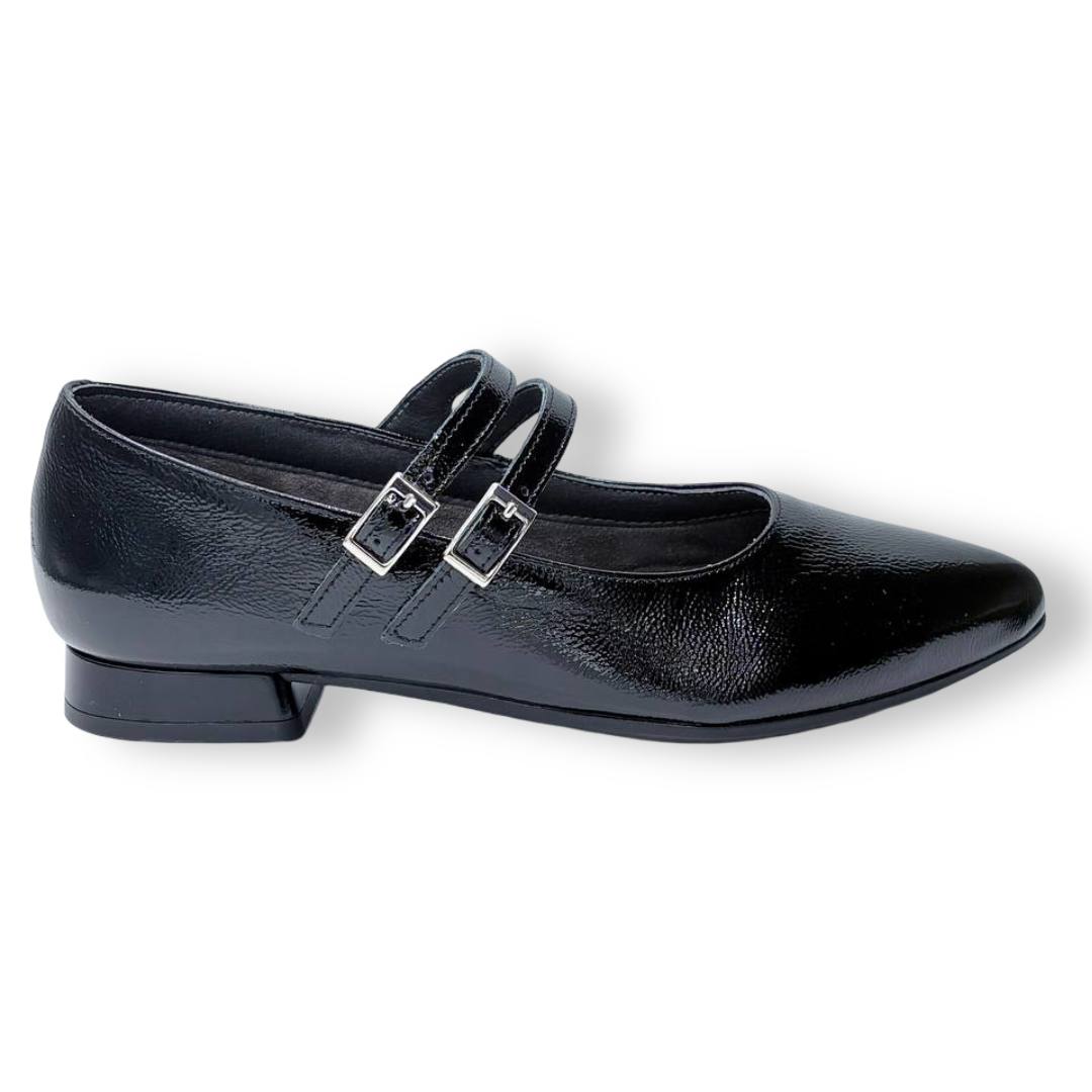 En las fotos se aprecia el acabado tipo charol con textura fina y dos tiras finas sobre el empeine, cada una con hebilla metálica regulable para mejorar el ajuste. La puntera es alargada con redondeo y el tacón es bajo y estable, ideal para caminar muchas horas sin fatiga.
