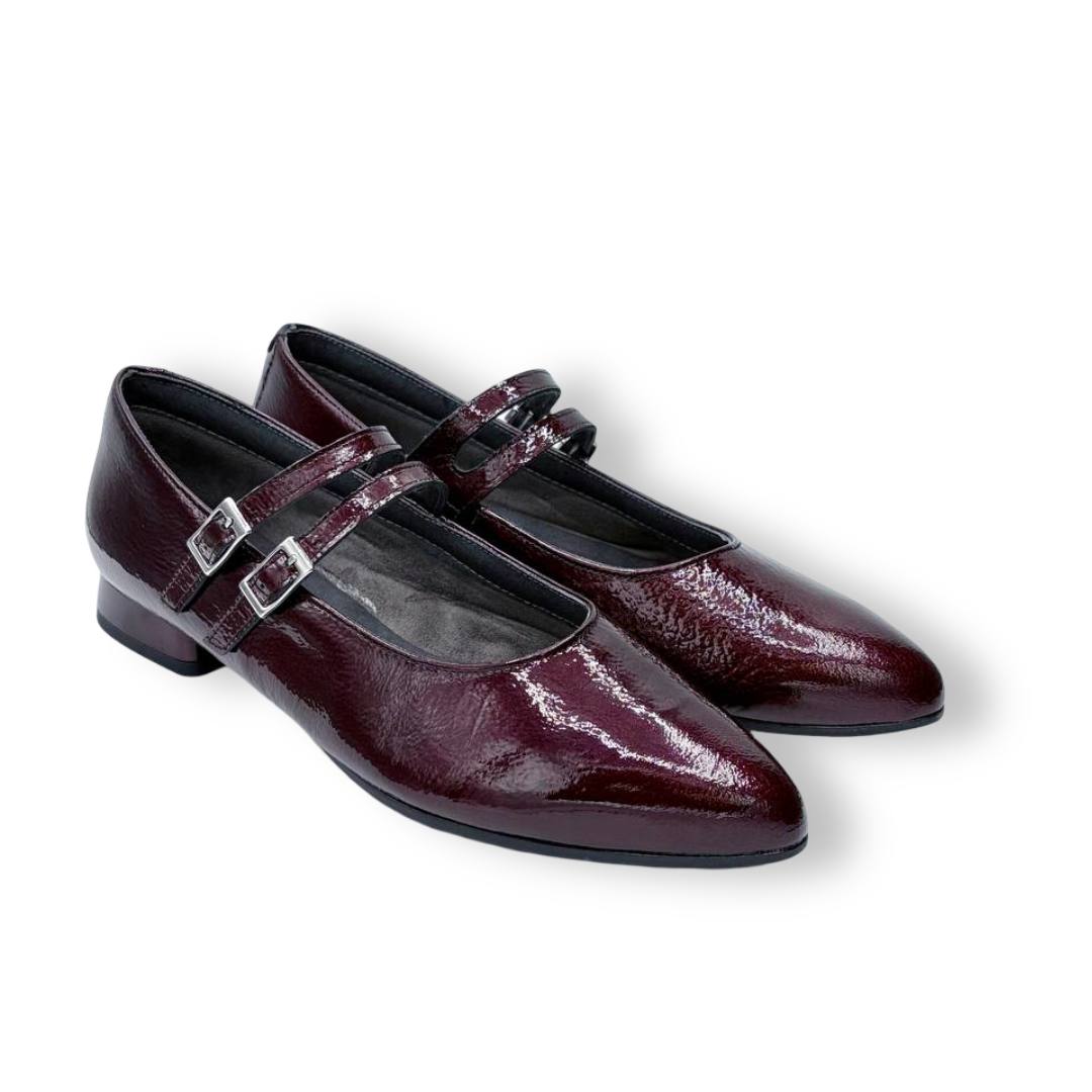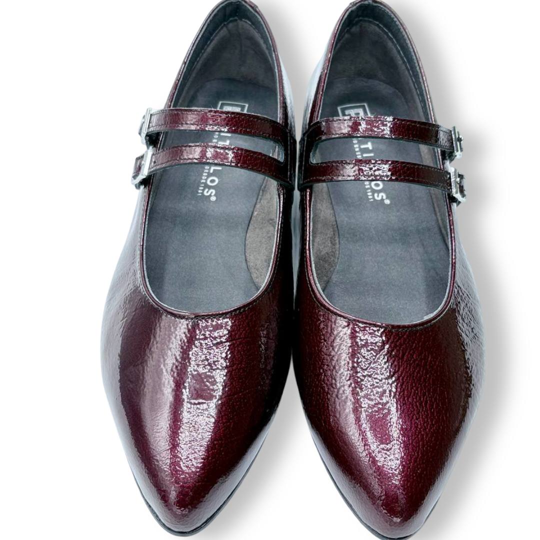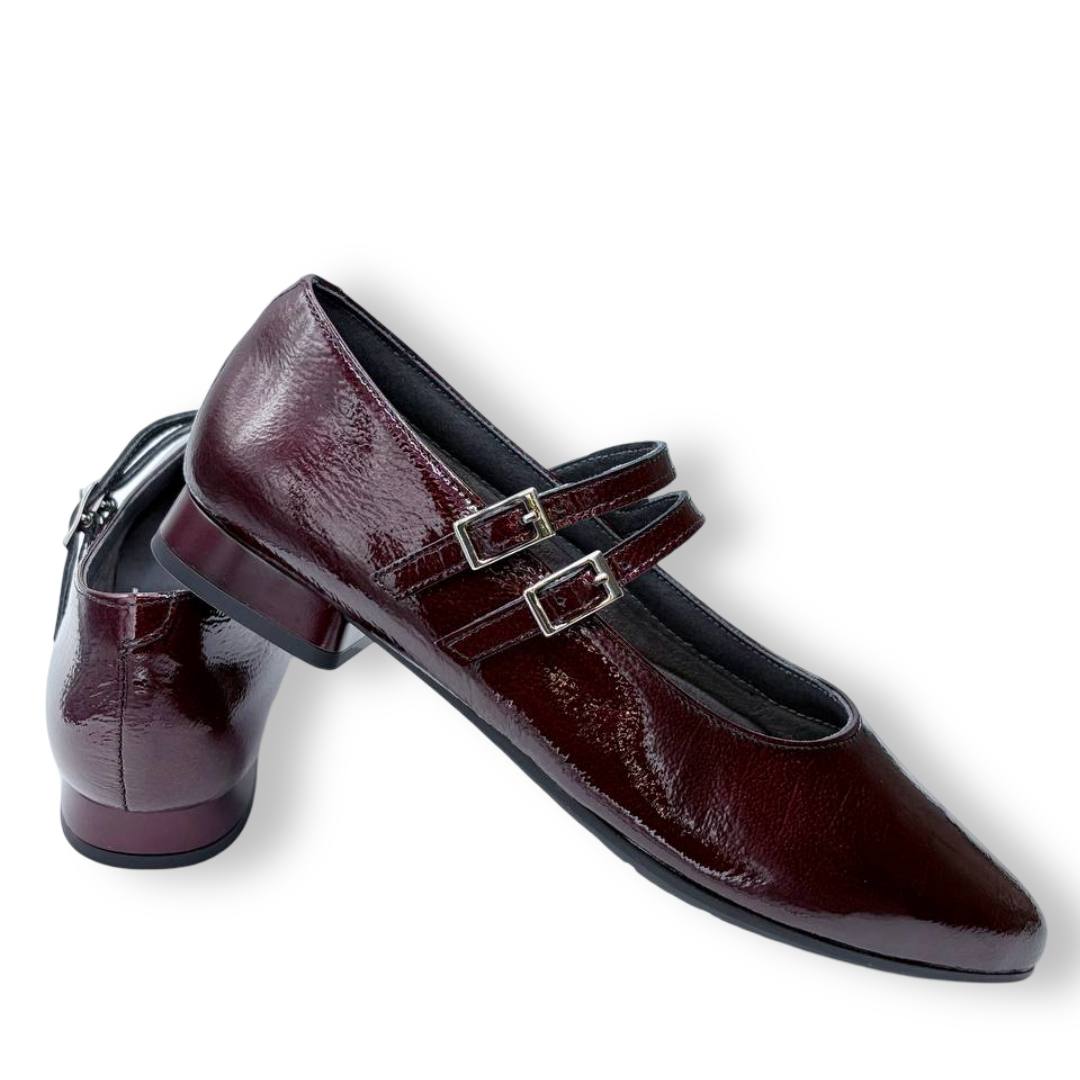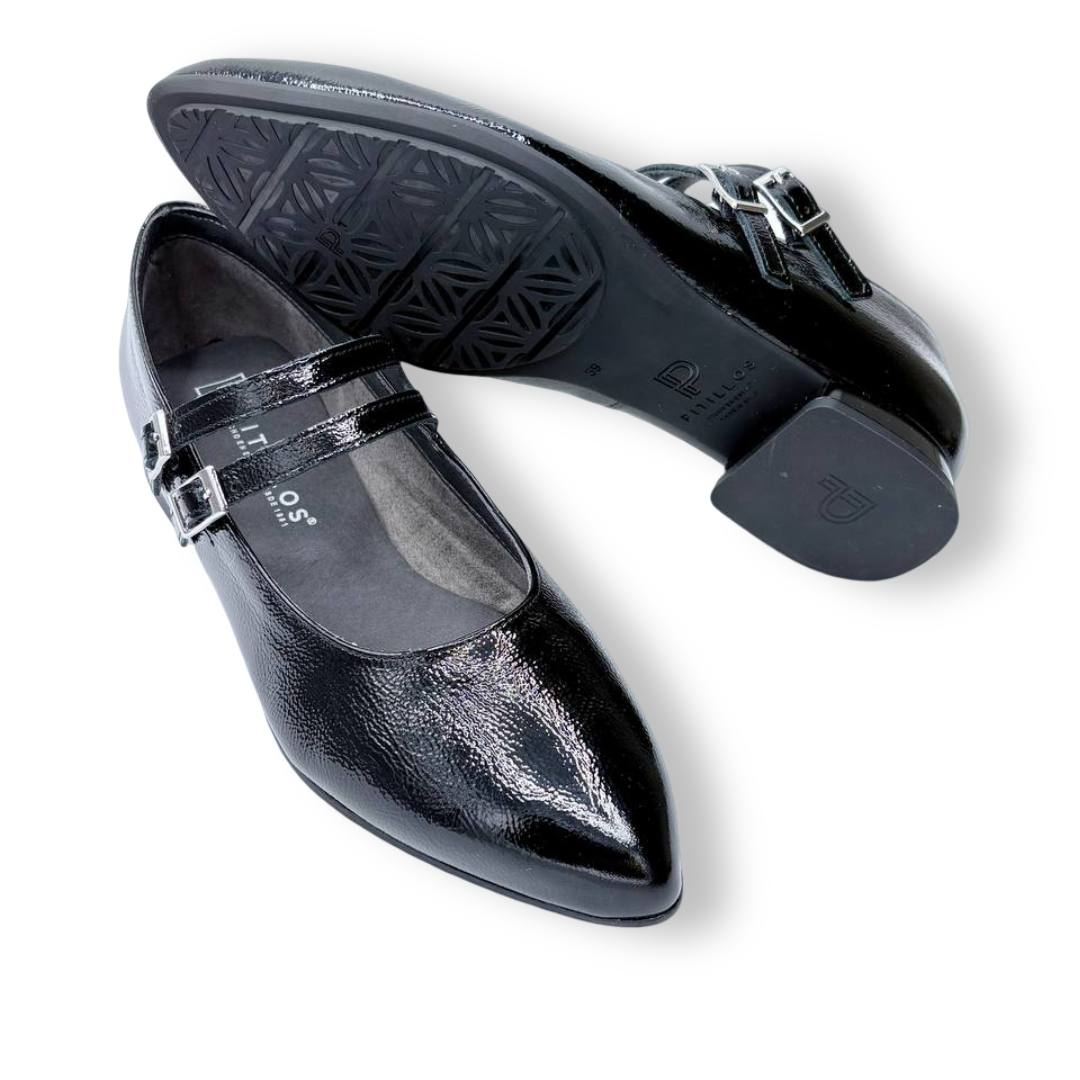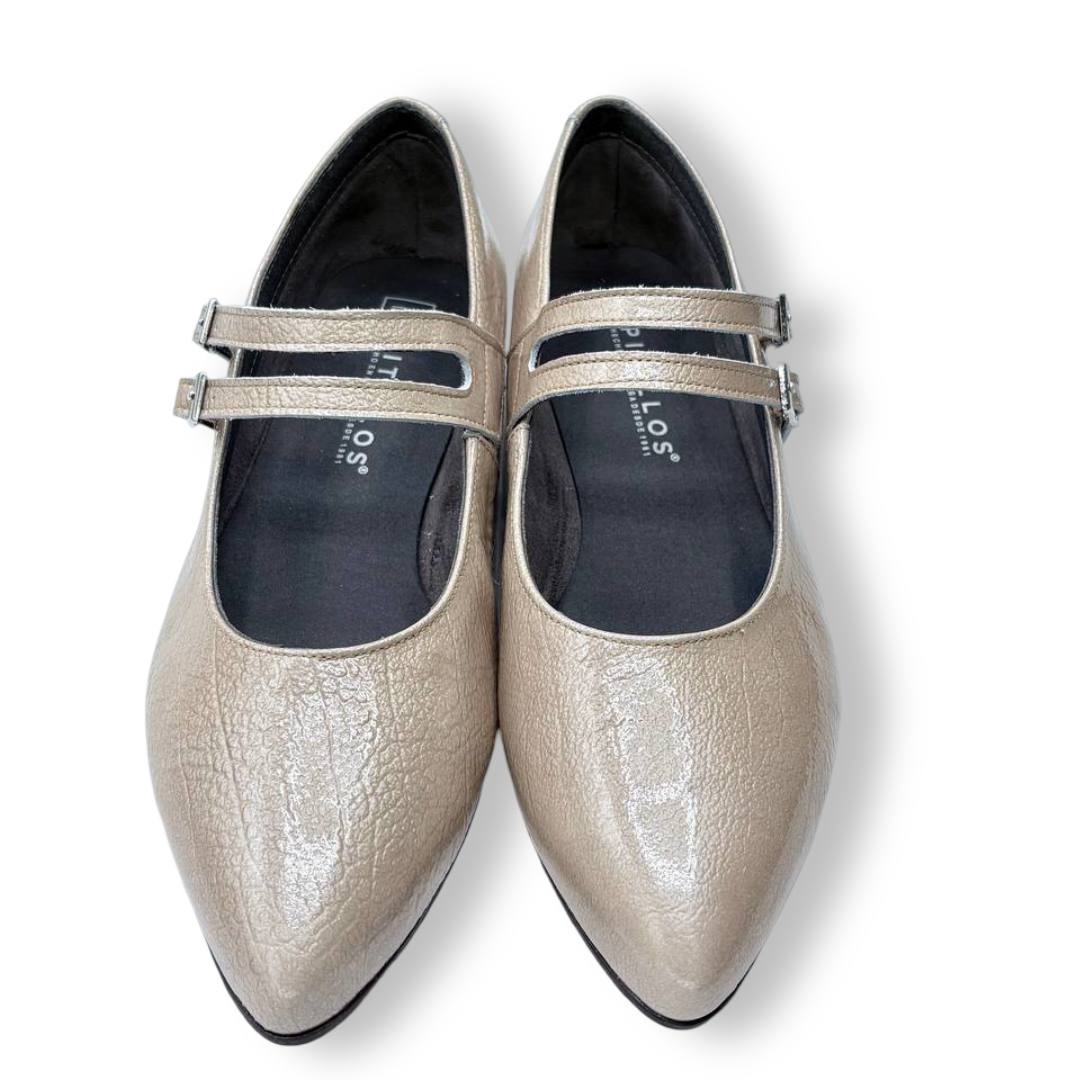 En las fotos se aprecia el acabado tipo charol con textura fina y dos tiras finas sobre el empeine, cada una con hebilla metálica regulable para mejorar el ajuste. La puntera es alargada con redondeo y el tacón es bajo y estable, ideal para caminar muchas horas sin fatiga.