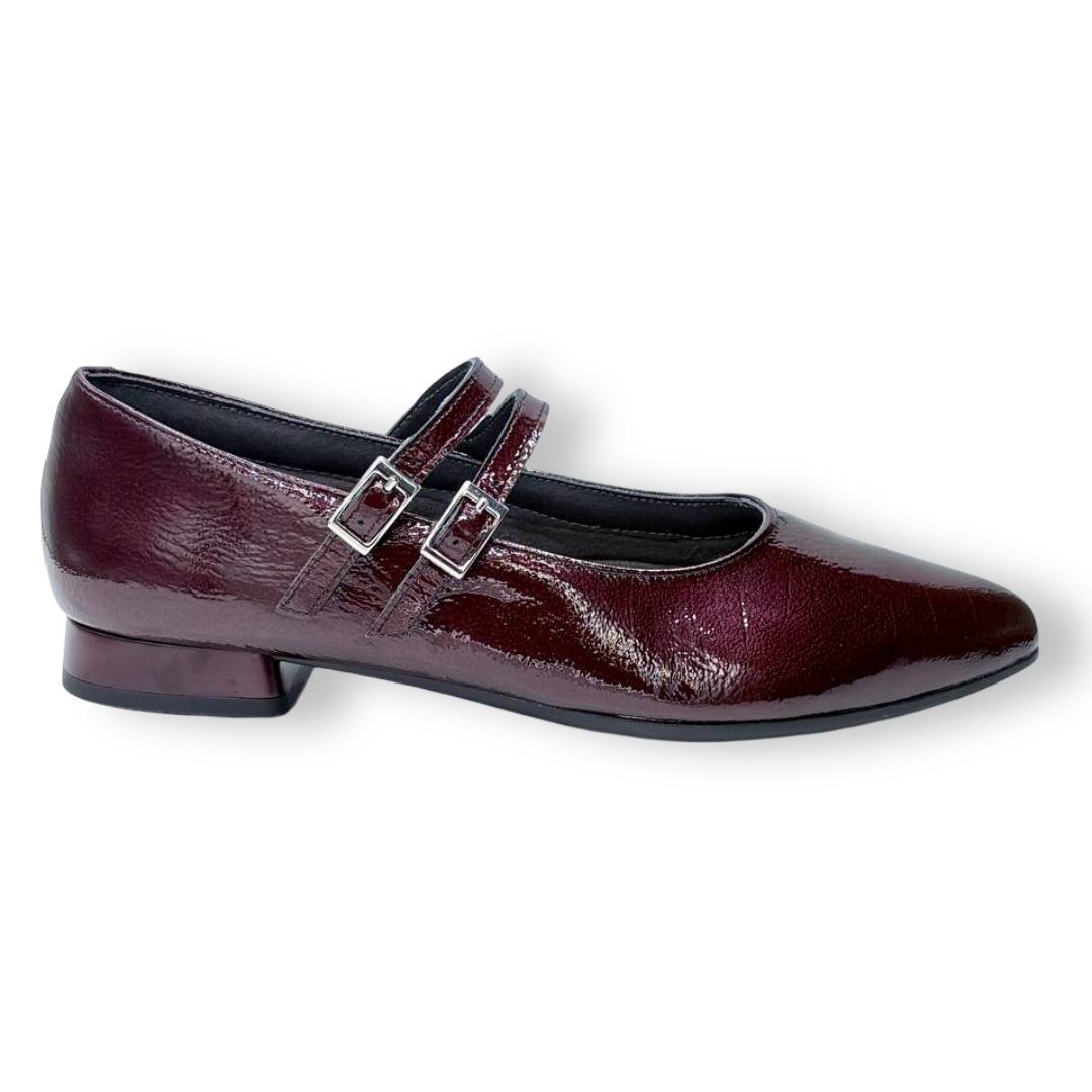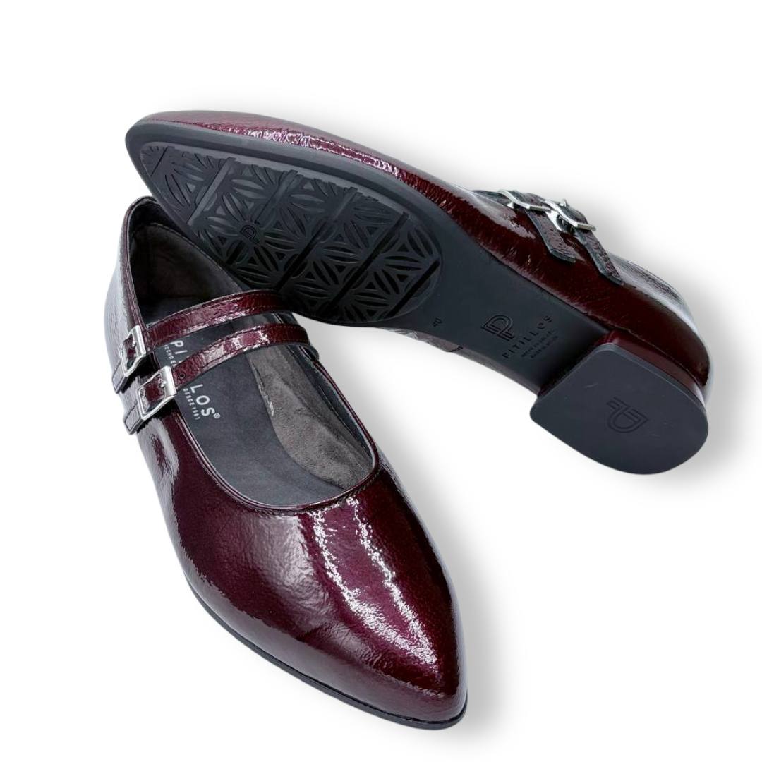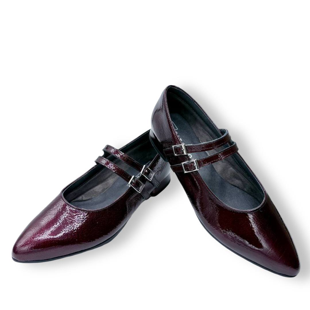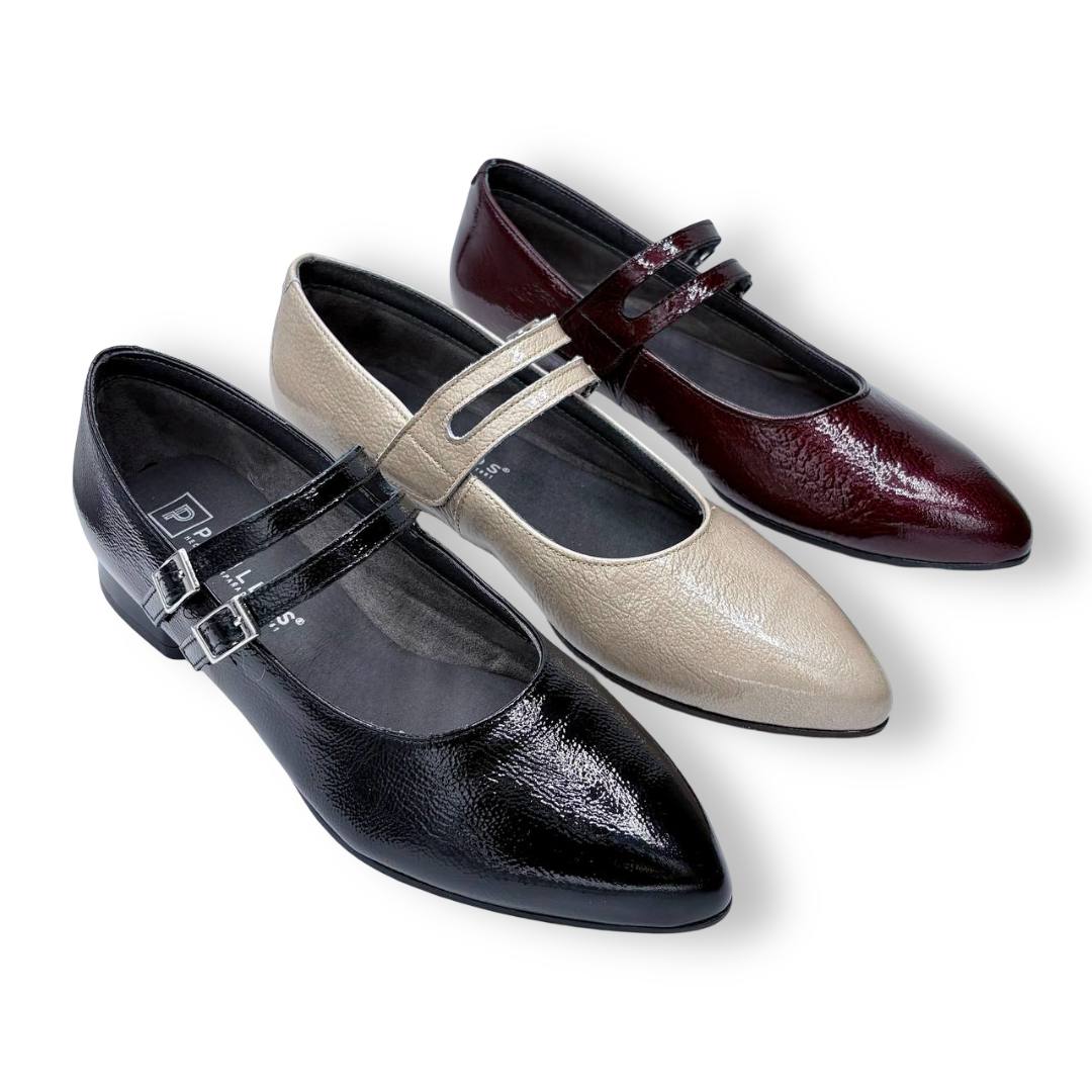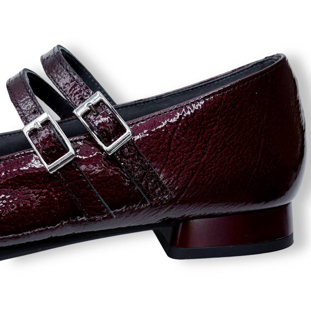 En las fotos se aprecia el acabado tipo charol con textura fina y dos tiras finas sobre el empeine, cada una con hebilla metálica regulable para mejorar el ajuste. La puntera es alargada con redondeo y el tacón es bajo y estable, ideal para caminar muchas horas sin fatiga.