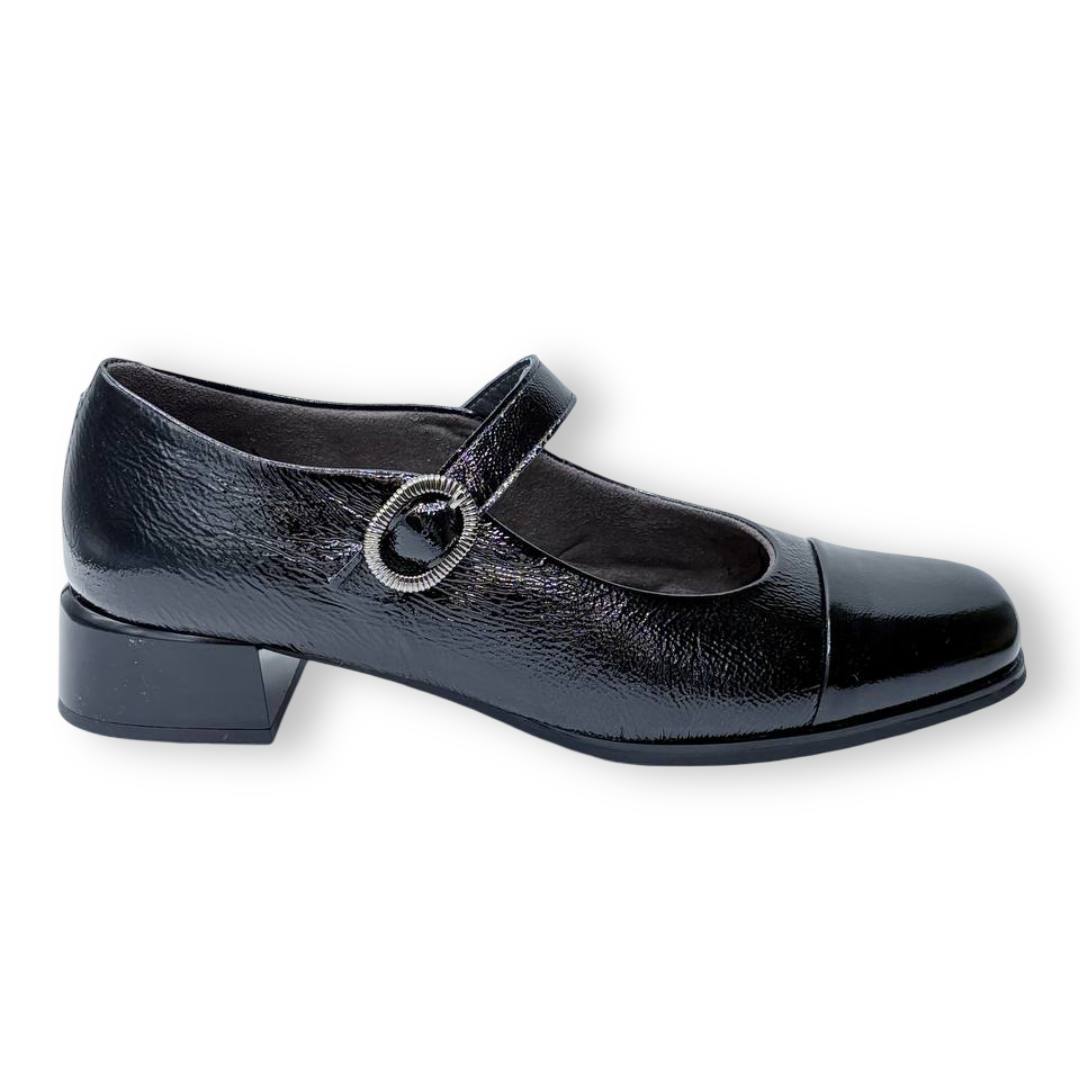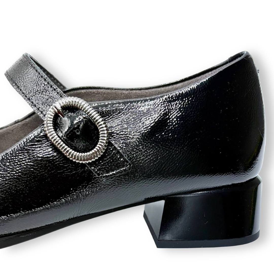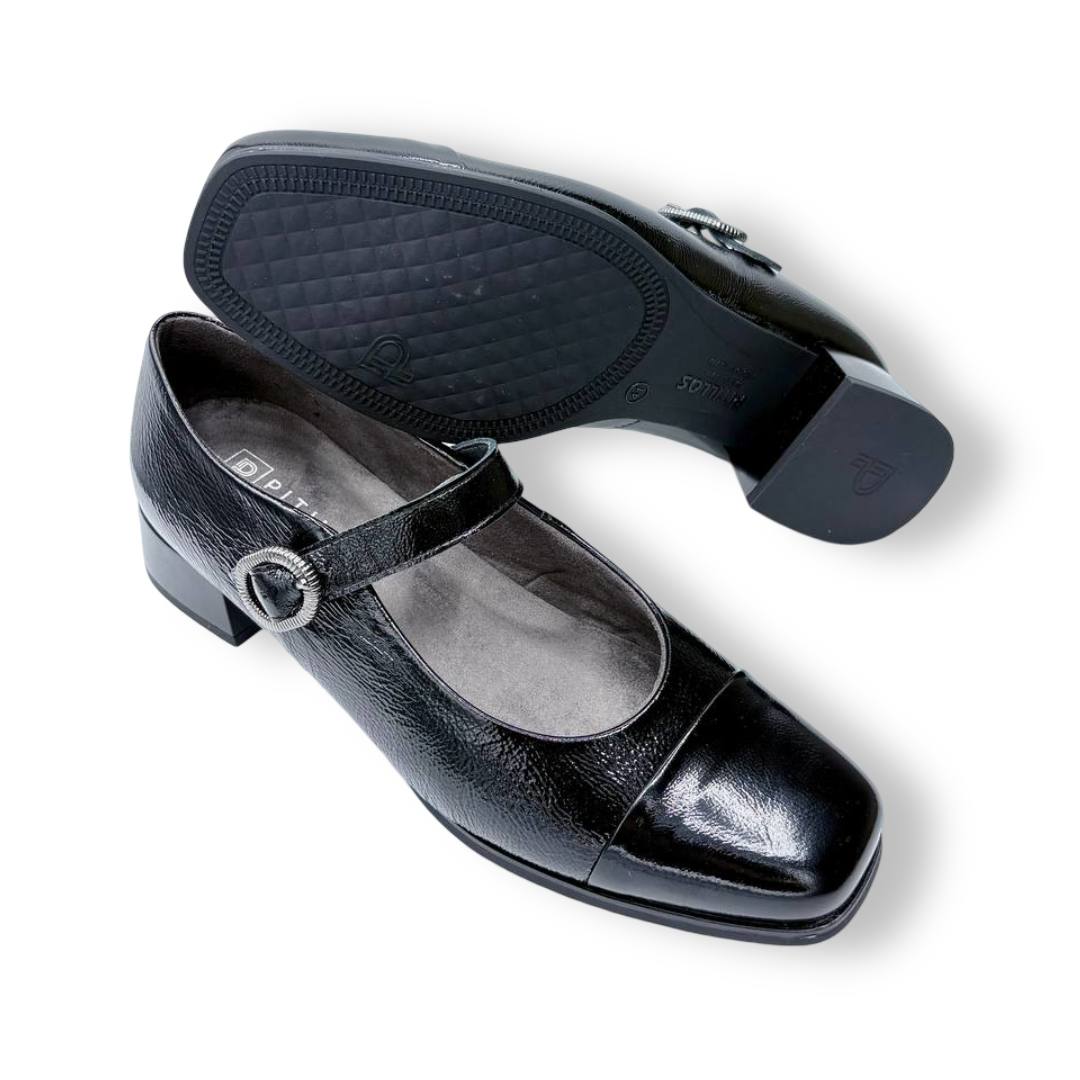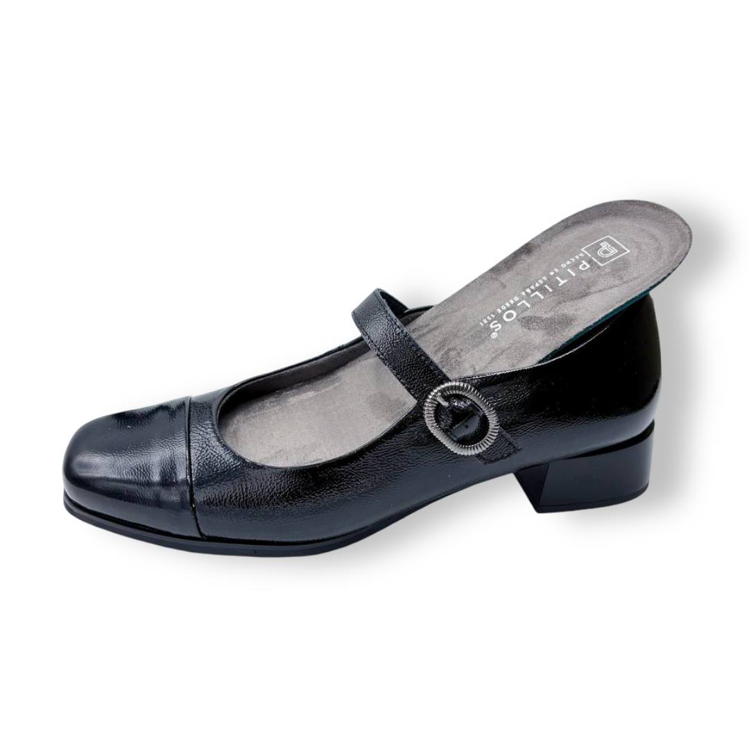 El Pitillos 10813 Negro es un salón de tacón medio con correa y un adorno de hebilla que aporta un toque distintivo sin perder elegancia. En las imágenes se aprecia el acabado charol con ligera textura y la puntera redondeada, muy favorecedora. El tacón medio, estable y de base generosa, ha sido pensado para caminar con seguridad durante la jornada.