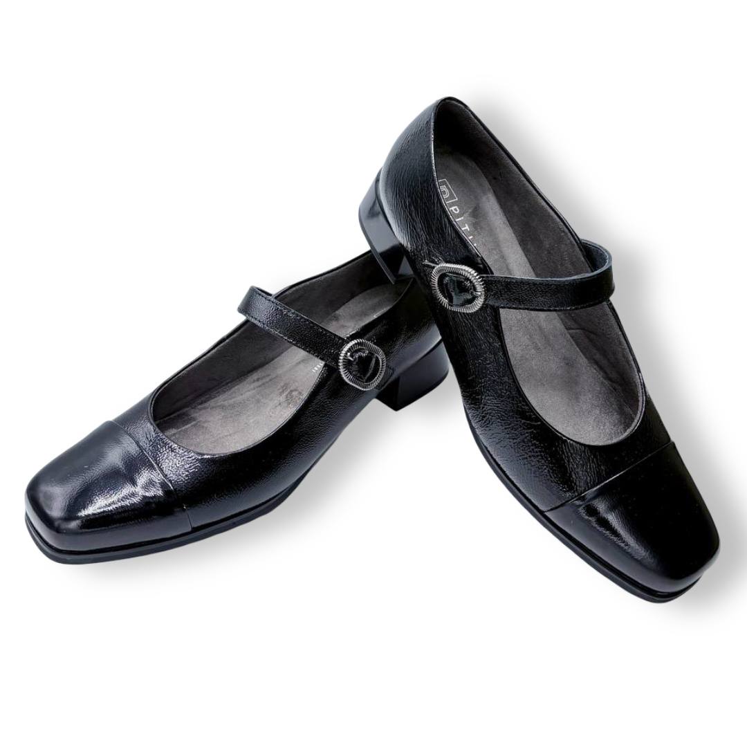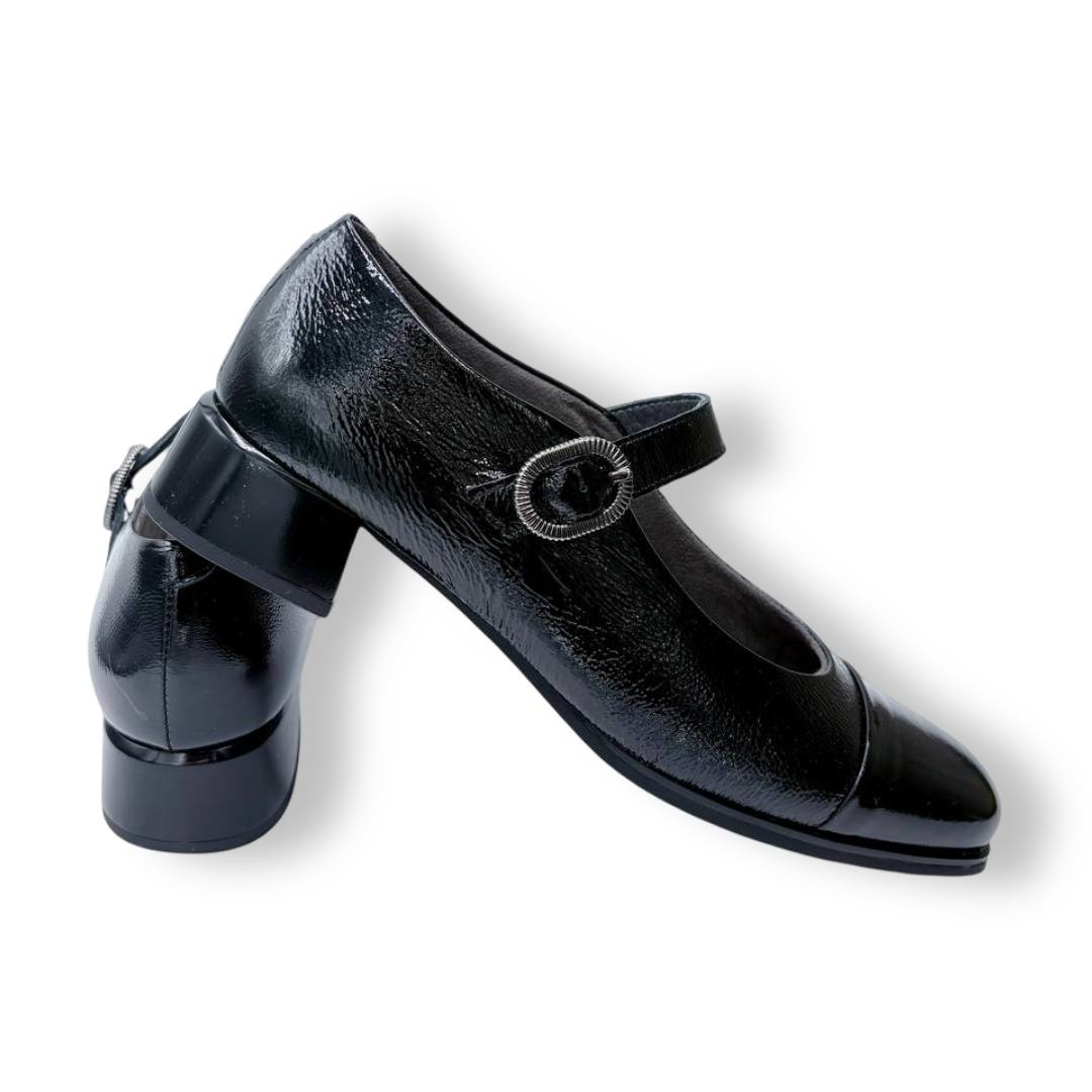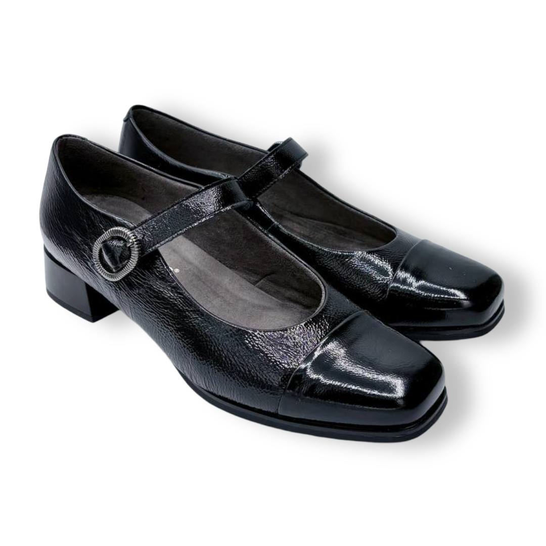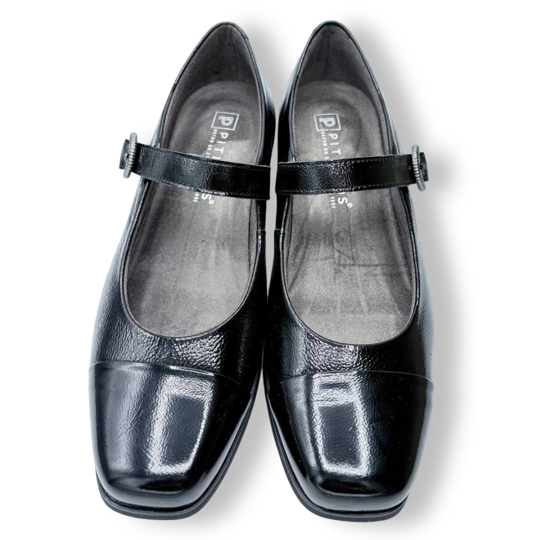El Pitillos 10813 Negro es un salón de tacón medio con correa y un adorno de hebilla que aporta un toque distintivo sin perder elegancia. En las imágenes se aprecia el acabado charol con ligera textura y la puntera redondeada, muy favorecedora. El tacón medio, estable y de base generosa, ha sido pensado para caminar con seguridad durante la jornada.