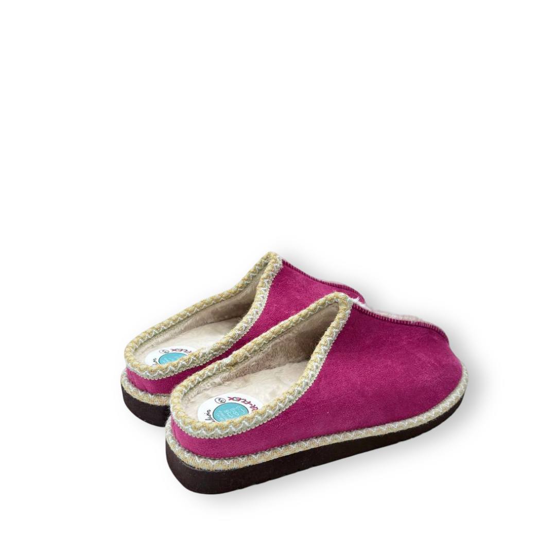 Zapatillas de casa Pelusín P100 fucsia o cuero, hechas en material tipo ante vegano con ribete artesanal. Calidez, color y confort 100 % español.