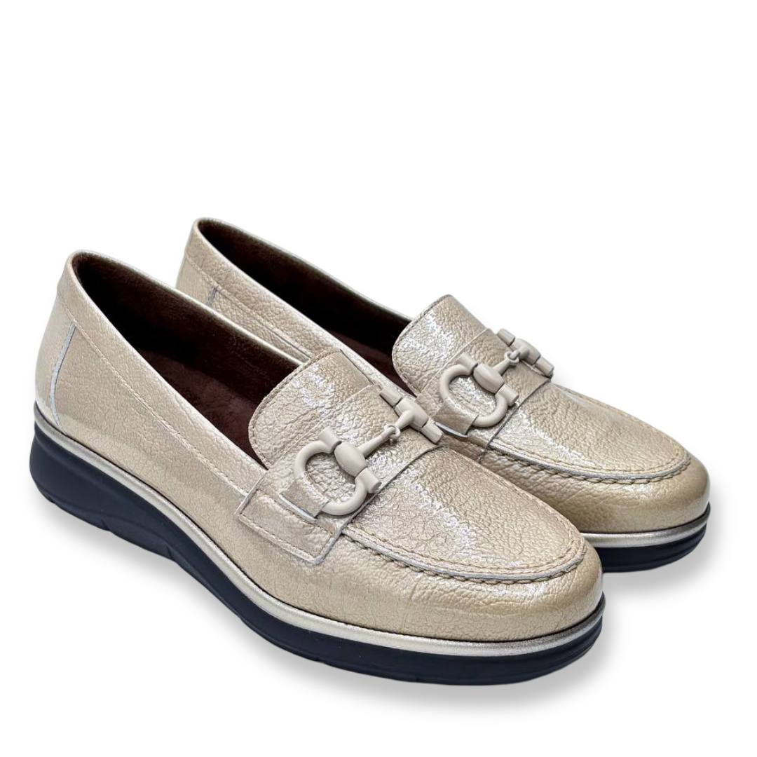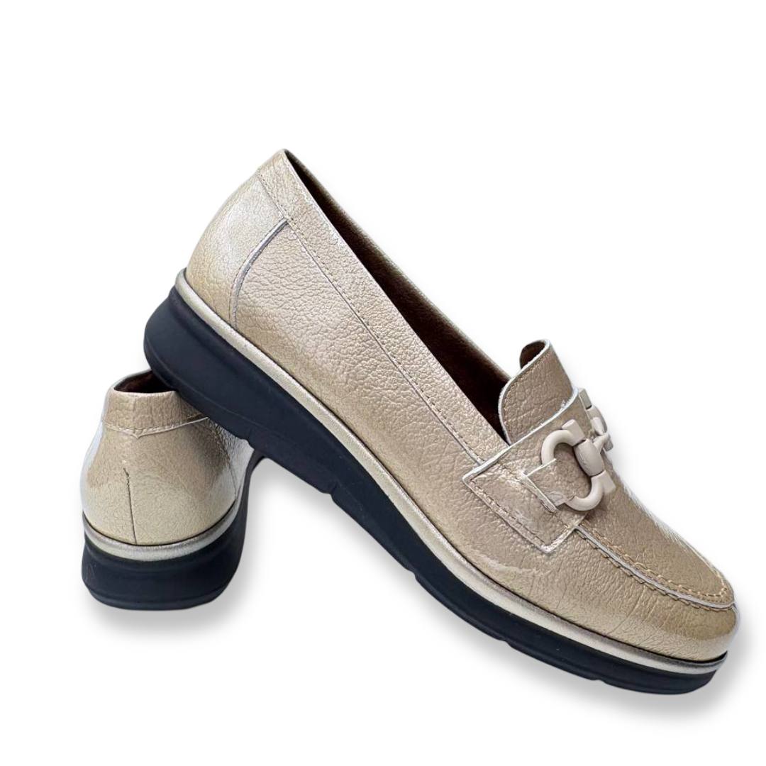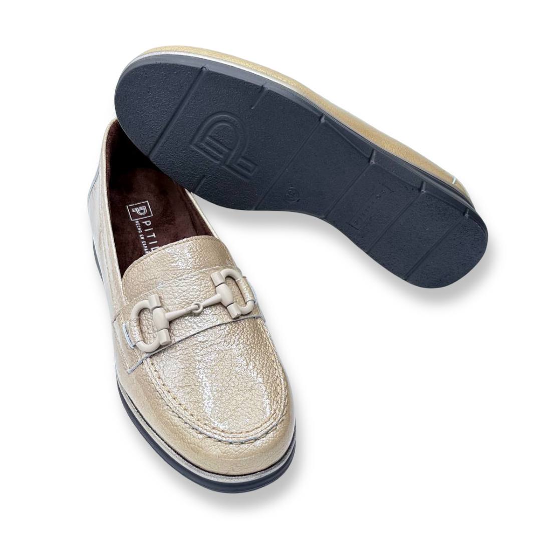 El mocasín PITILLOS 10701 color piedra y negro está pensado para mujeres que buscan estilo casual con total comodidad. Su corte en piel acharolada combina tonos neutros con un diseño actual y funcional.